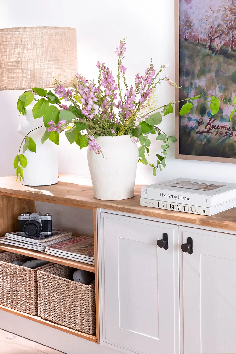 Privilégiez les ensembles aux objets individuels . Sur une console, une table basse ou une commode : disposez un plateau avec trois objets (un livre, une bougie, un vase, par exemple). Cela allège visuellement l’espace et donne une impression de soin au quotidien.