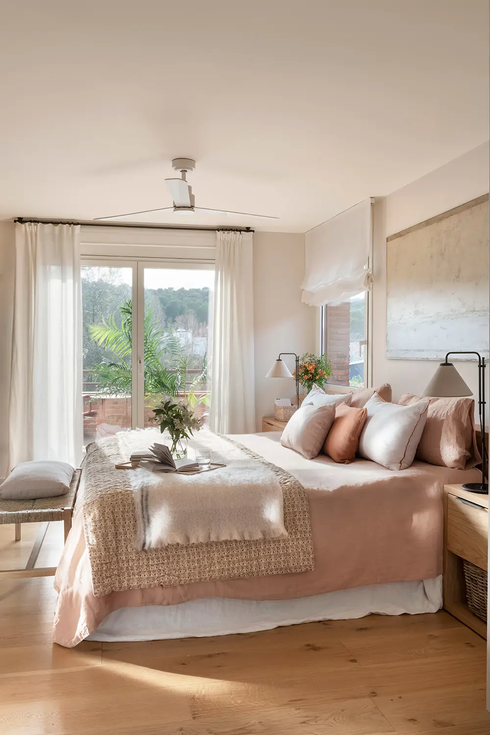 Pour janvier, votre objectif économique pour cette chambre est de créer une ambiance sensorielle : privilégiez le coton, le lin ou des mélanges naturels respirants pour habiller votre lit.