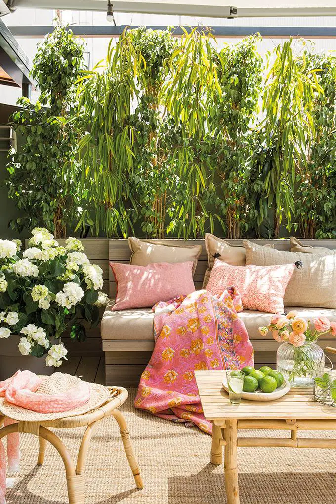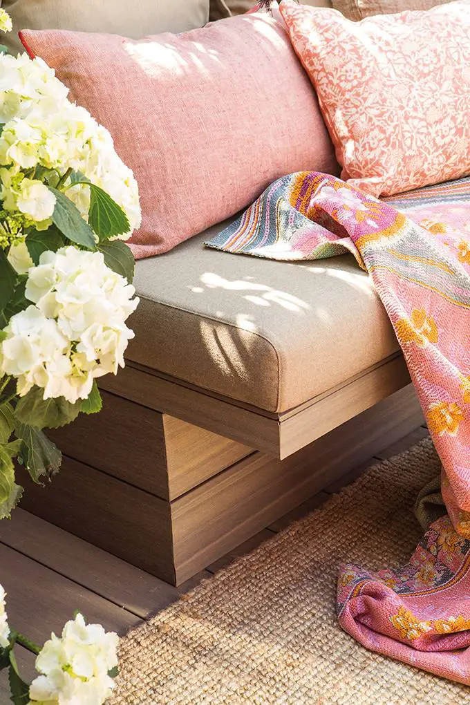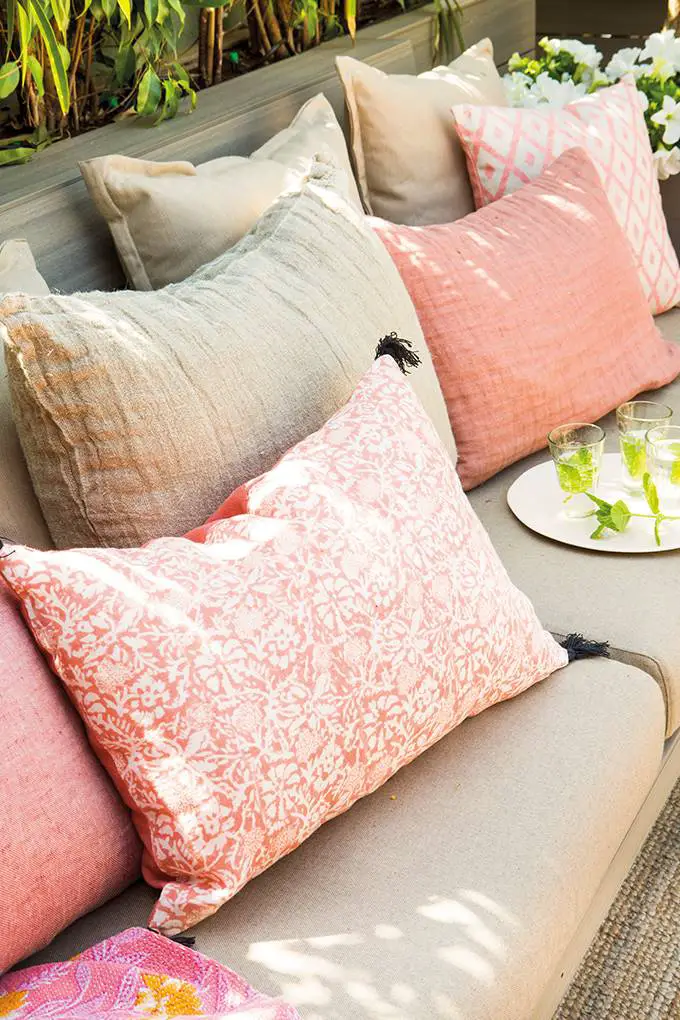 Nous avons ajouté des coussins en lin et en coton roses, parfaits pour le printemps et pour créer une ambiance chaleureuse. Nous pouvons vous aider à choisir les coussins pour votre terrasse ici.