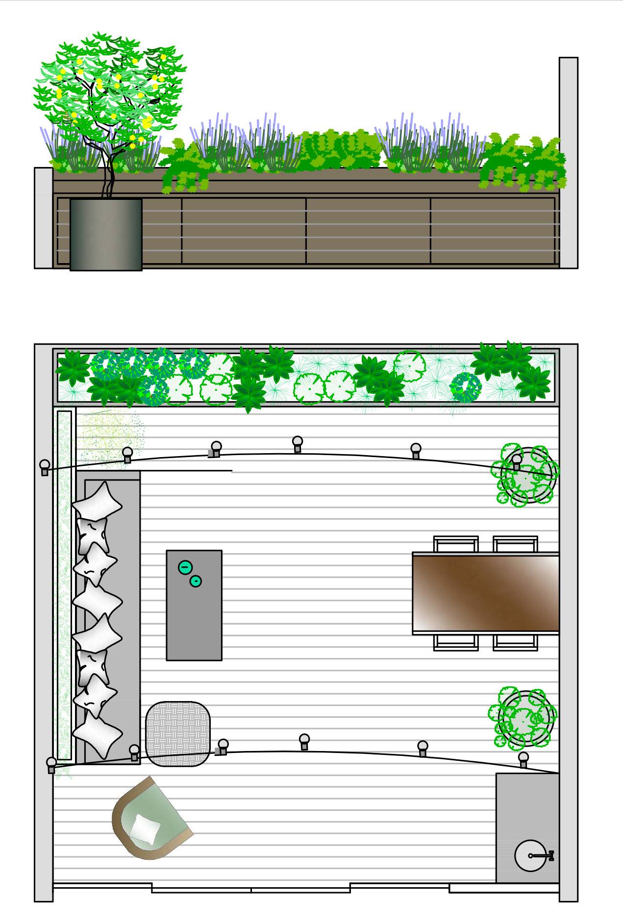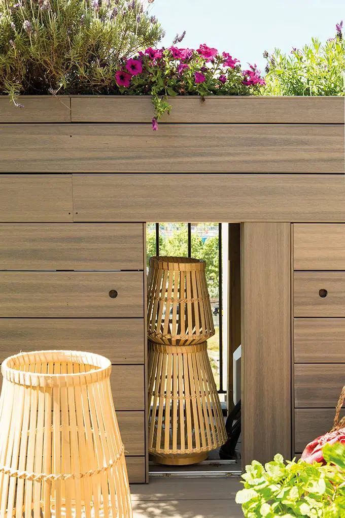 La jardinière qui longe le mur de la terrasse cache bien son jeu. Elle dissimule astucieusement des portes coulissantes à l’arrière, offrant ainsi un espace de rangement. De quoi garder tout propre et bien rangé.