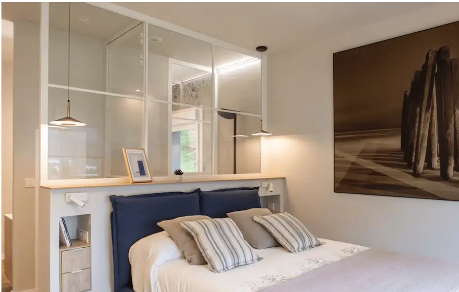 Imaginez une tête de lit qui s’apparente à un élément architectural , et non à un simple meuble. Il s’agit ici d’un panneau de verre à mi-hauteur qui laisse entrer la lumière et sépare l’espace nuit de la salle de bains attenante. C’est une idée parfaite pour un studio pour séparer deux espaces au sein d’une même pièce sans rajouter de cloison supplémentaire.