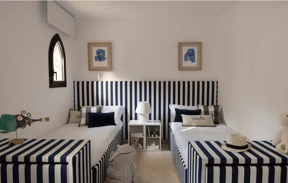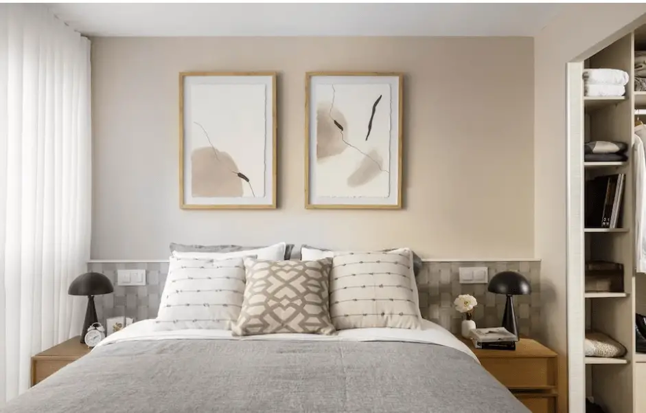 Pour structurer l’espace de la tête de lit, le décorateur d’intérieur Alberto Torres a imaginé une partie inférieure recouverte d’un papier peint à l’aspect textile – évoquant un tissu tissé ou du lin – et une partie supérieure peinte dans une couleur assortie. Une discrète frise blanche sépare les deux parties et structure l’ensemble.