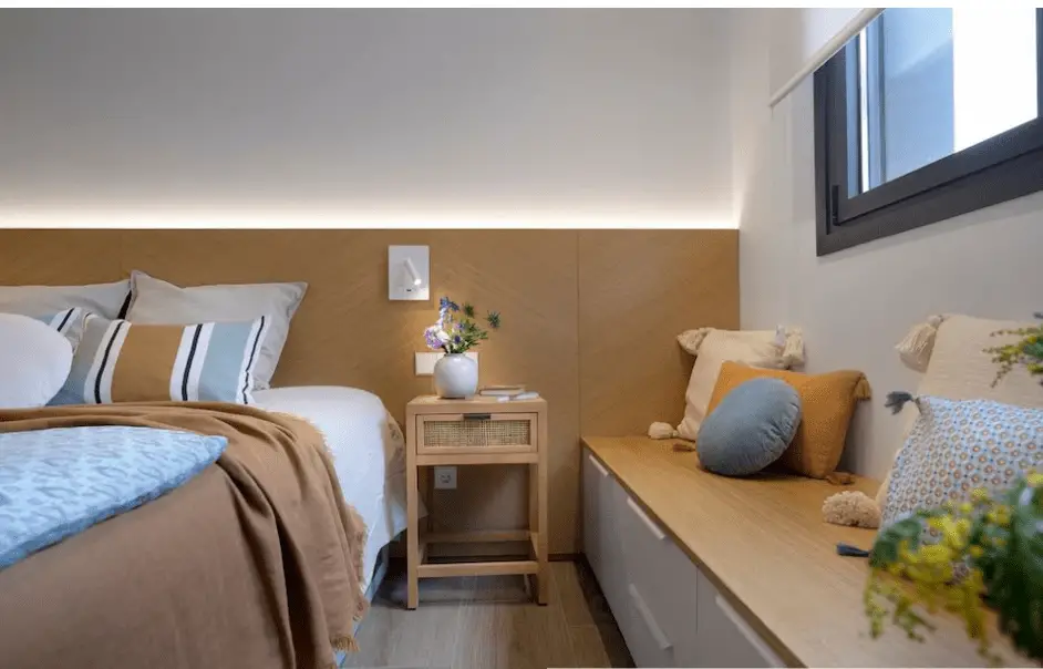 Les têtes de lit avec éclairage intégré métamorphosent une chambre en un clin d’œil . Ce modèle, signé Wood Estudio Interiorismo, habille l’intégralité du mur et intègre une fine ligne de LED encastrées en partie supérieure. La lumière, diffusée uniformément, crée une atmosphère apaisante.