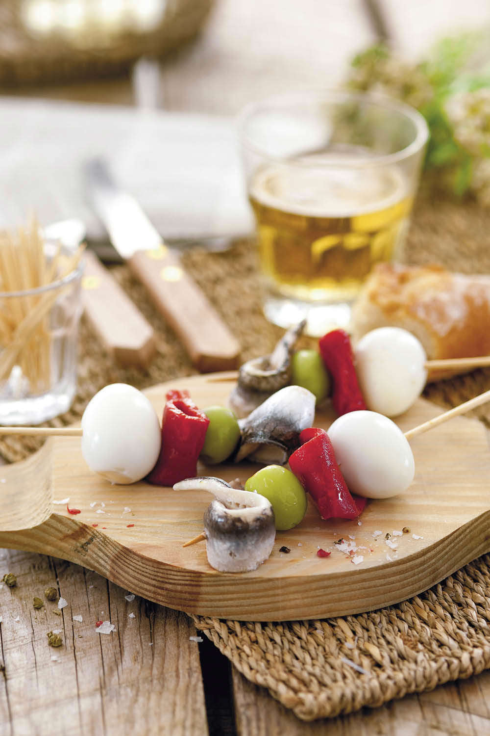 Enfilez sur une brochette un œuf dur, un demi-poivron piquillo, une olive et un filet d’anchois mariné.