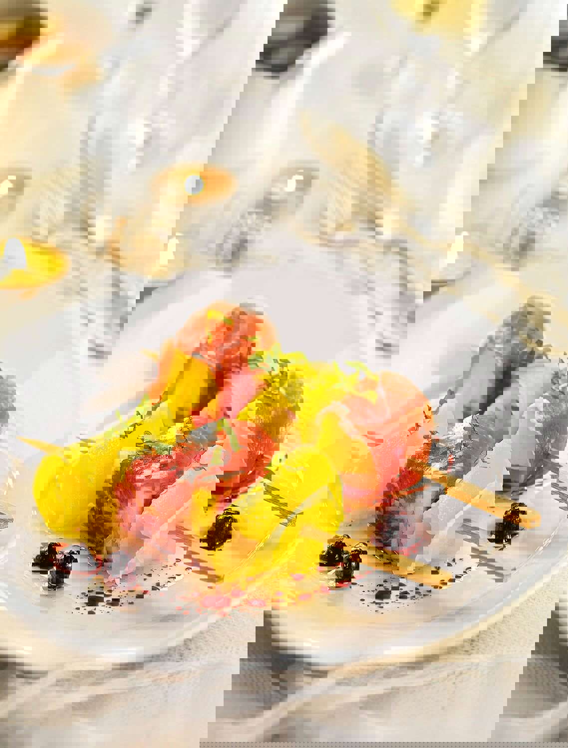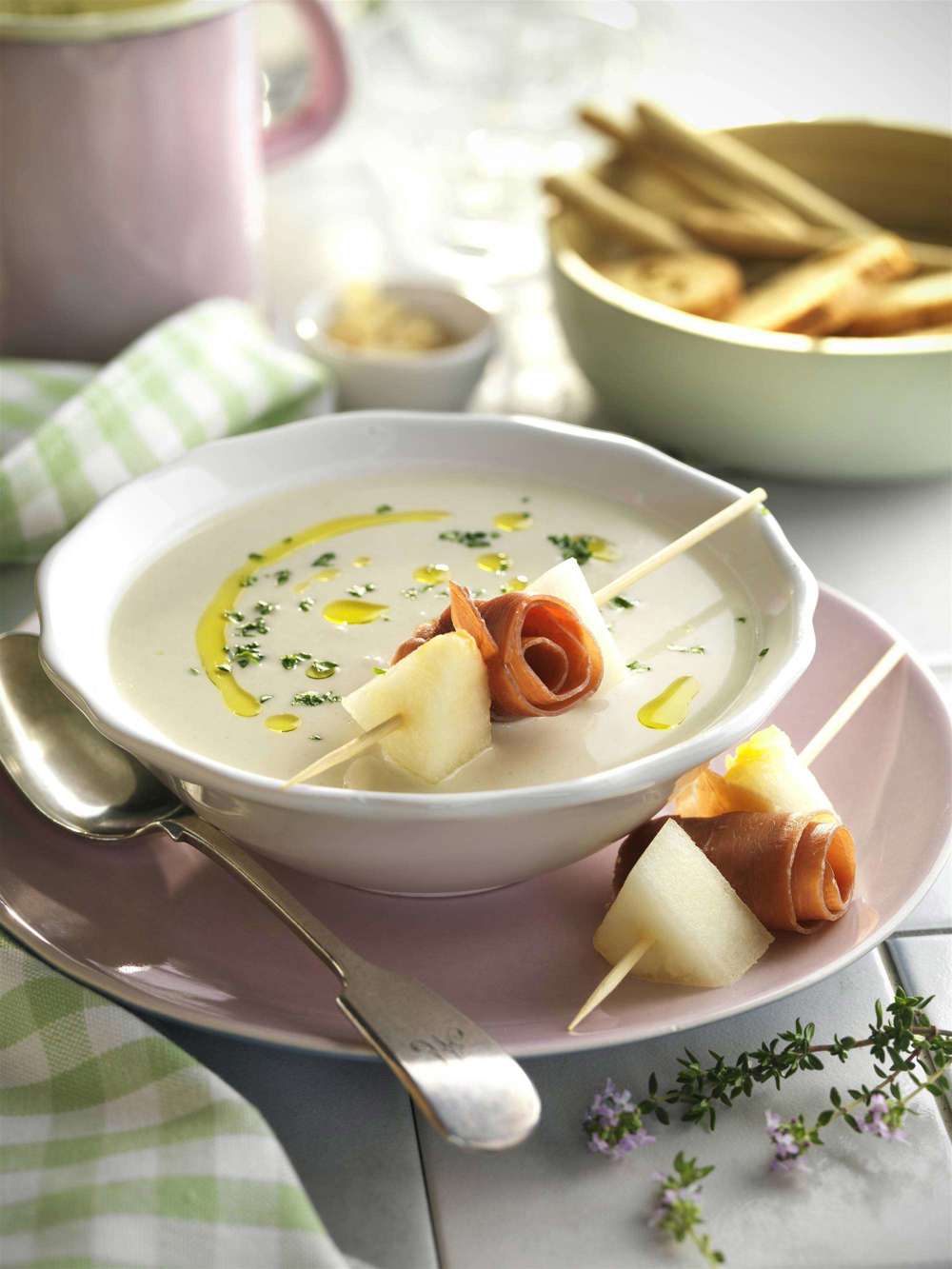 Le contraste sucré-salé fonctionne généralement très bien à Noël, nous vous proposons donc une délicieuse brochette pour accompagner la crème que vous allez servir en entrée , en l’occurrence un ajoblanco.
