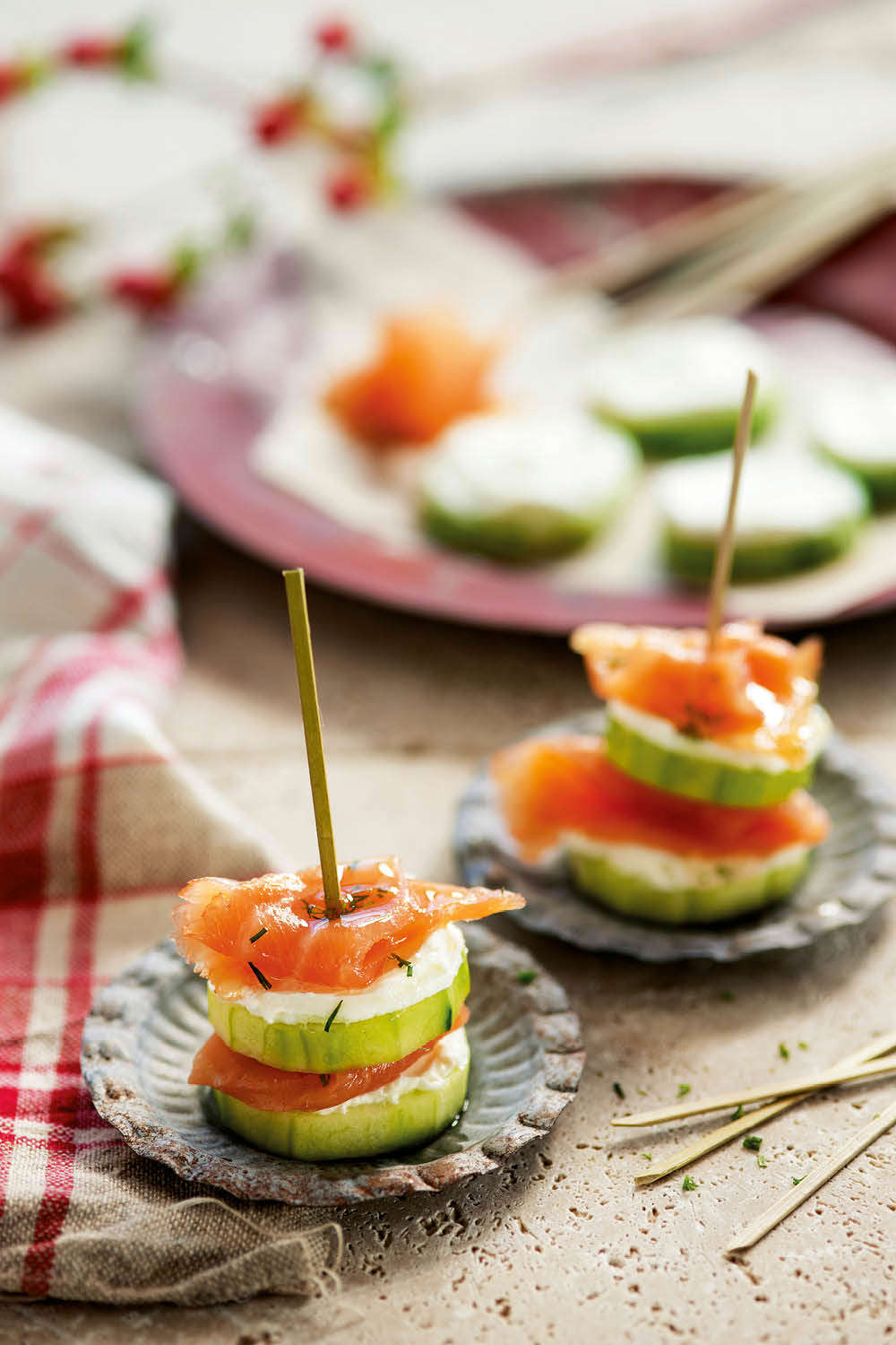 Répétez l’assemblage du concombre, du fromage et du saumon fumé et fixez le tout avec un cure-dent pour éviter que la salade ne se défasse.