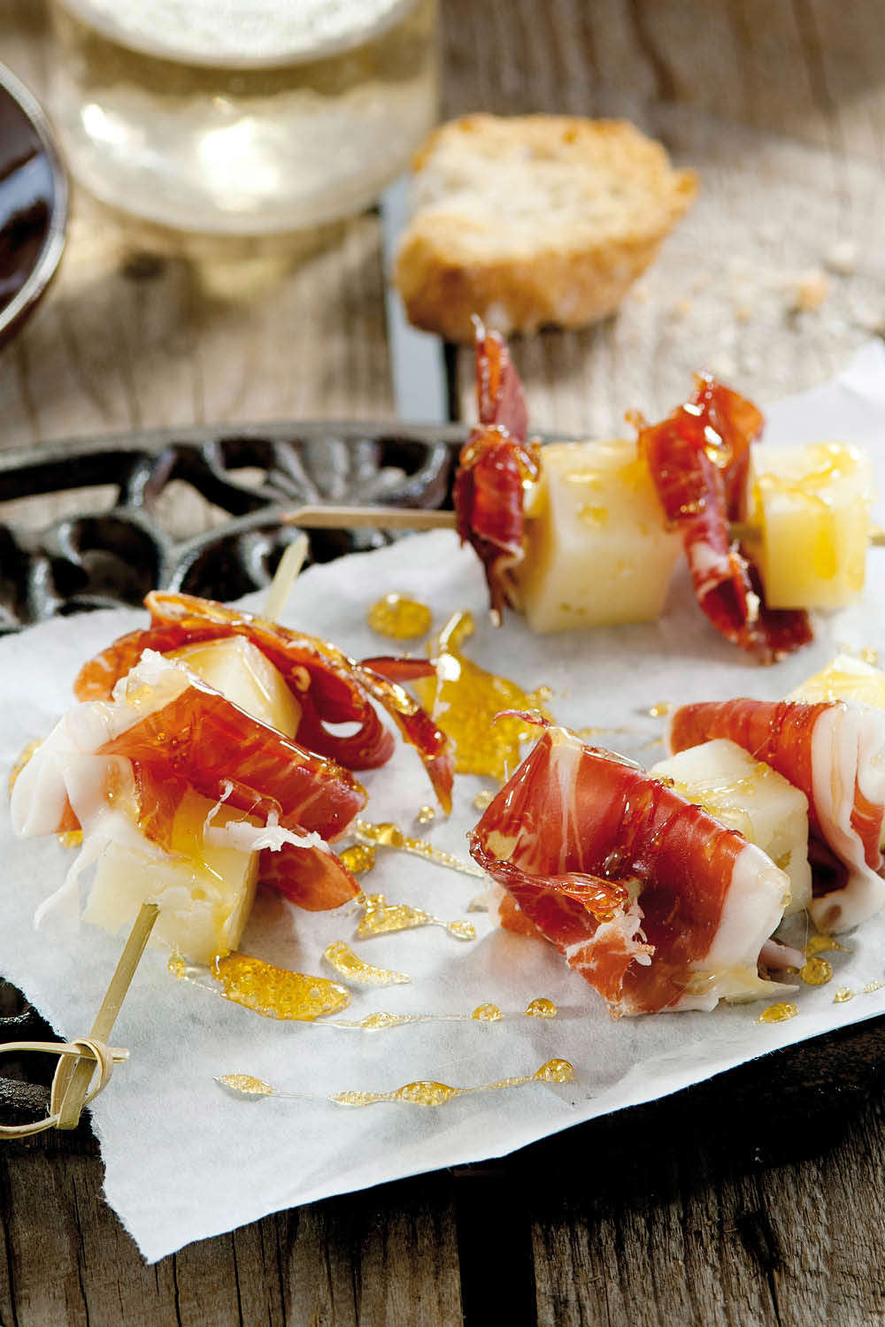 Le fromage et le jambon sont deux éléments essentiels de notre gastronomie ; vous pouvez donc leur donner une touche gourmande pour ces fêtes en les présentant sous forme de brochette et avec un filet de miel.