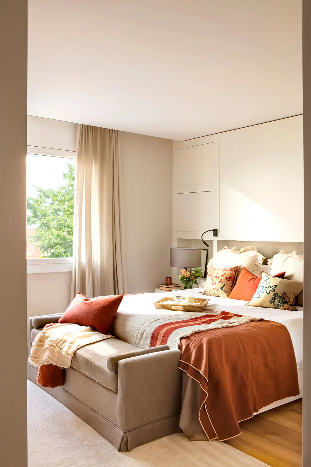 Repenser sa chambre ne se résume pas à changer de textiles pour 2026. L’idée, très « El Mueble », est d’ajouter un banc au pied du lit : il apporte une touche architecturale à la pièce et, de surcroît, résout un problème pratique (poser le couvre-lit, des vêtements ou un plateau).