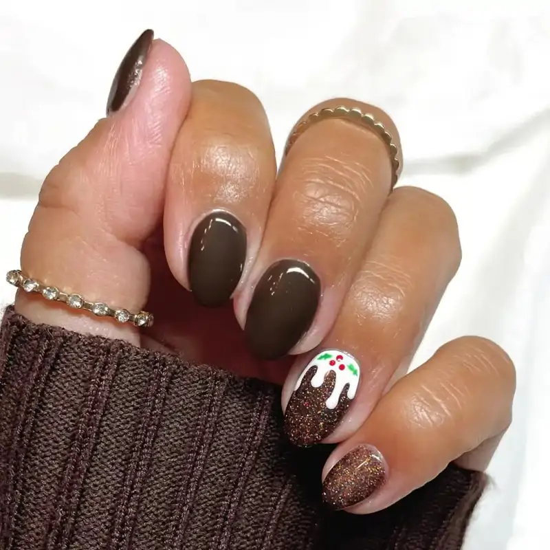 Le brun chocolat est la base idéale pour créer un effet hivernal avec un dégradé imitant la neige. Appliquer un vernis blanc à la base de l’ongle et un brun chocolat nacré sur le bout crée une transition douce qui évoque les paysages enneigés de la saison.