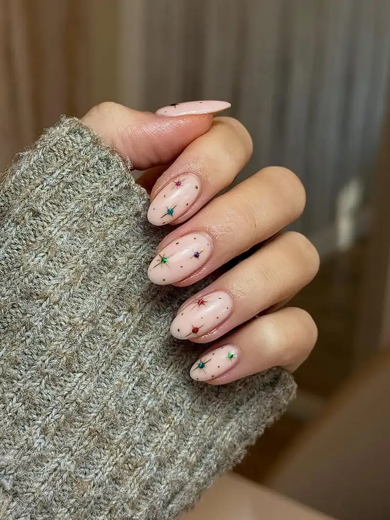 Ces motifs apportent une touche festive à vos ongles, tout en subtilité. Les petites paillettes colorées, discrètes et élégantes, évoquent les décorations de Noël et illuminent vos ongles d’une touche de magie des fêtes, sans rien perdre de leur élégance.