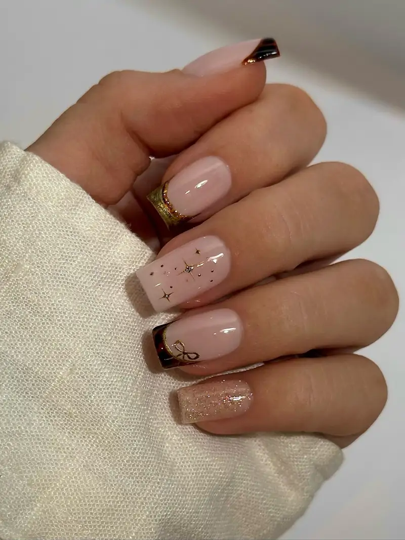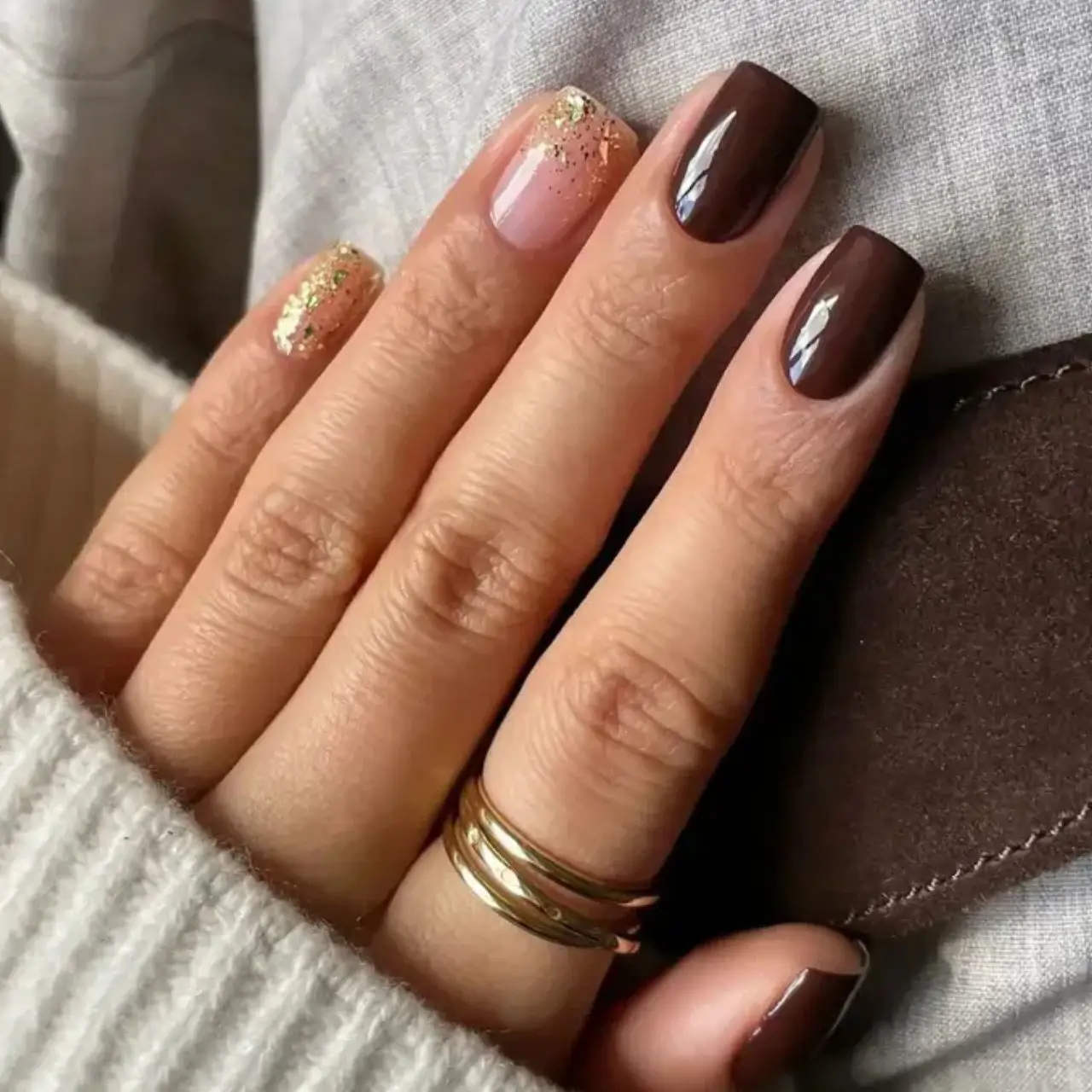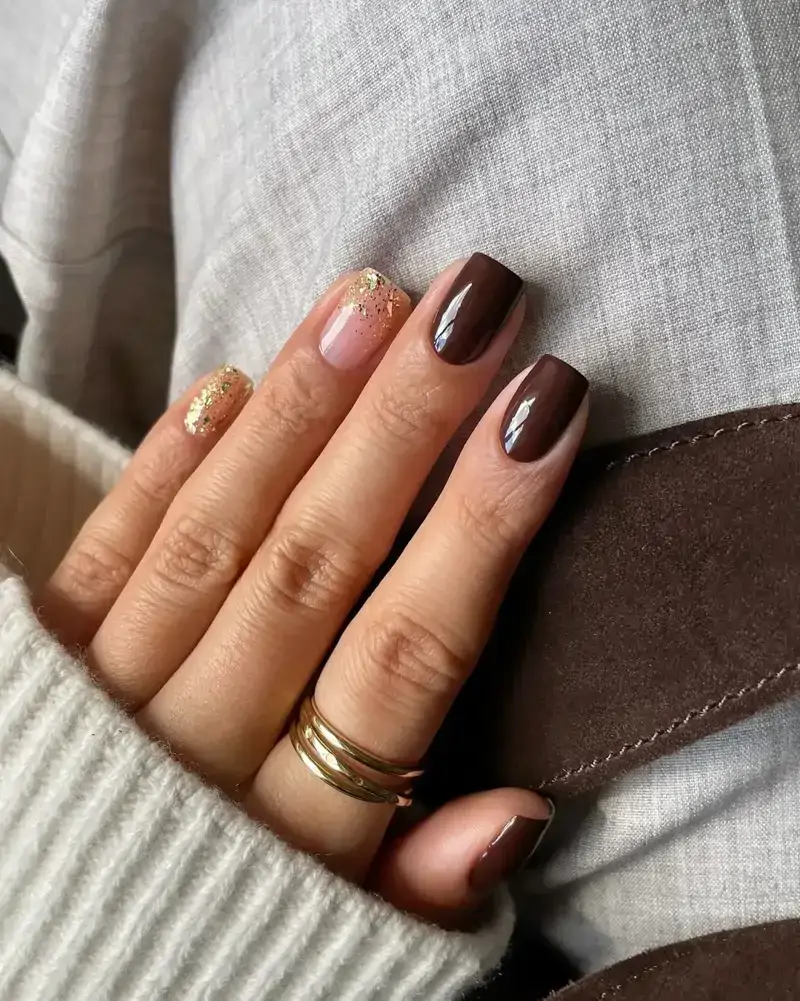 L’une des combinaisons les plus élégantes consiste à appliquer du brun comme base sur certains ongles et, sur d’autres, à ajouter un vernis doré scintillant, pour une touche festive si recherchée en cette fin d’année.