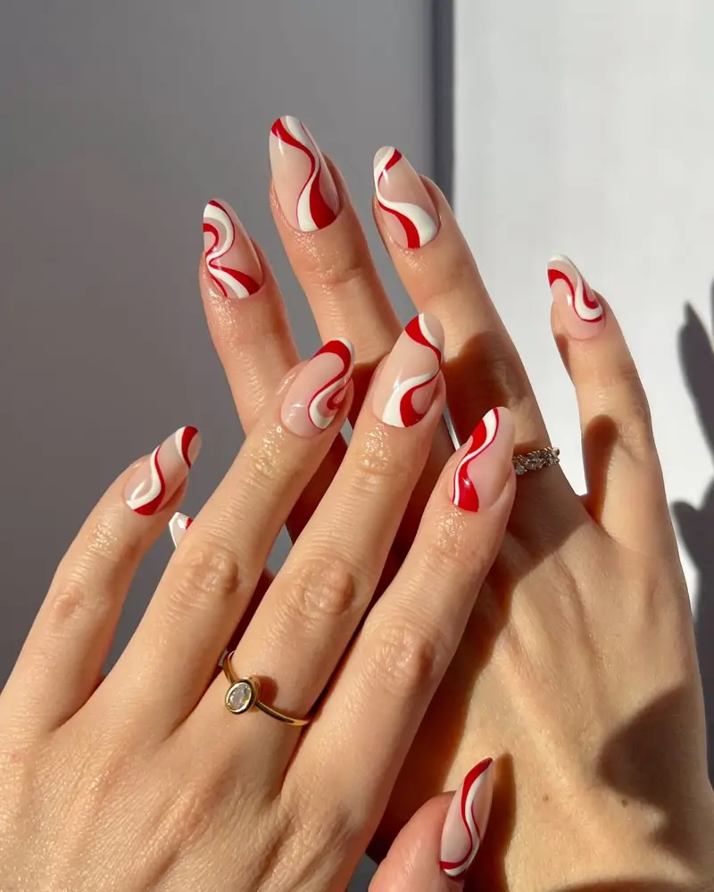 Inspirée des cannes de Noël, cette manucure revisite les couleurs classiques rouge et blanc des fêtes avec une touche de modernité.