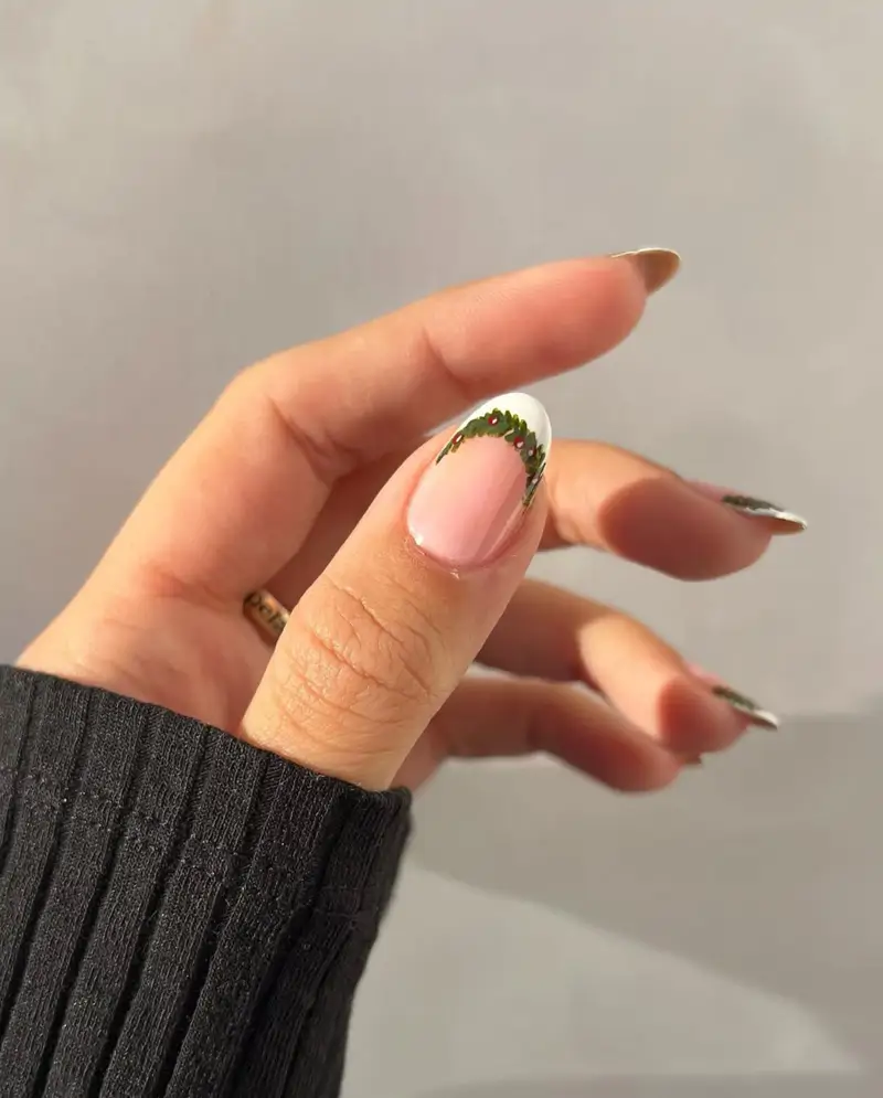 La manucure française se réinvente sans cesse, et pour Noël, elle s’offre une parure inspirée du gui : les pointes blanches classiques cèdent la place à de petits motifs verts et rouges savamment disposés sur l’ongle, apportant une touche festive délicate et élégante.
