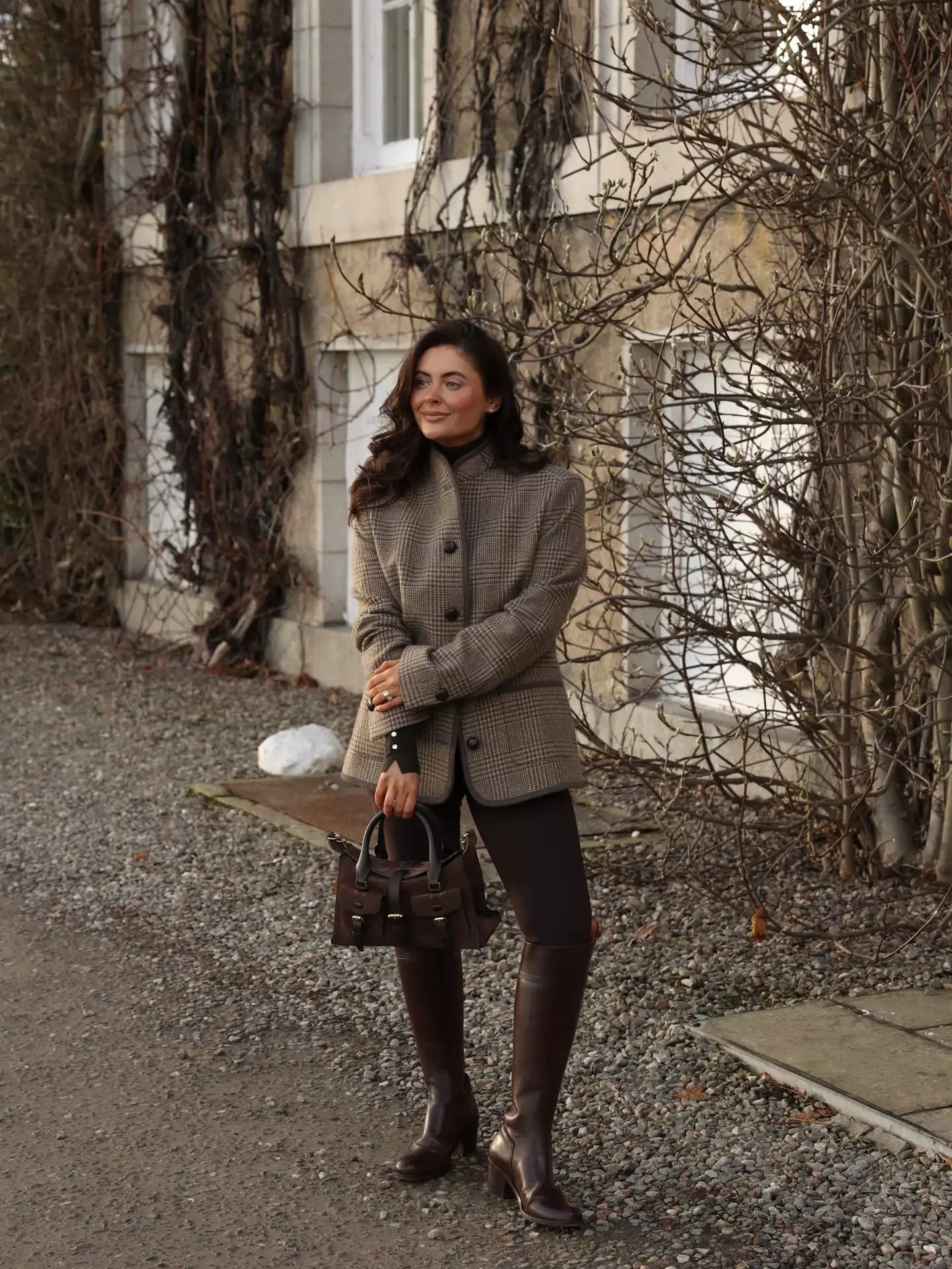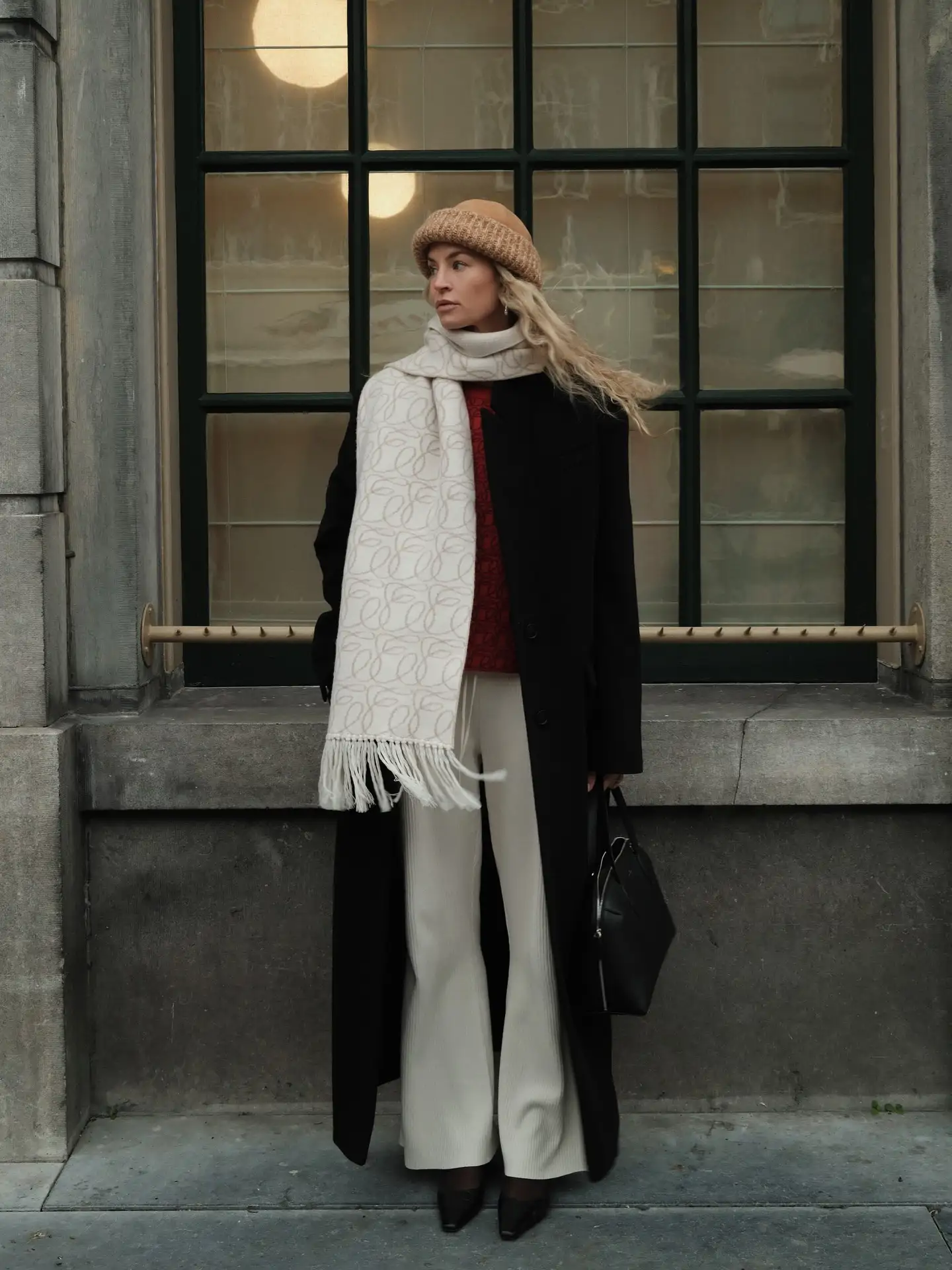 1.Long manteau marron sur une tenue entièrement noire