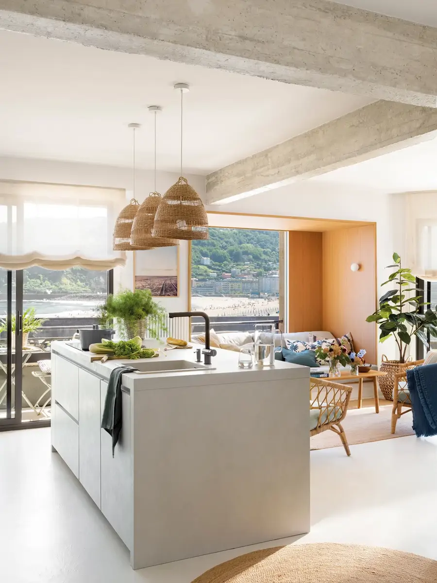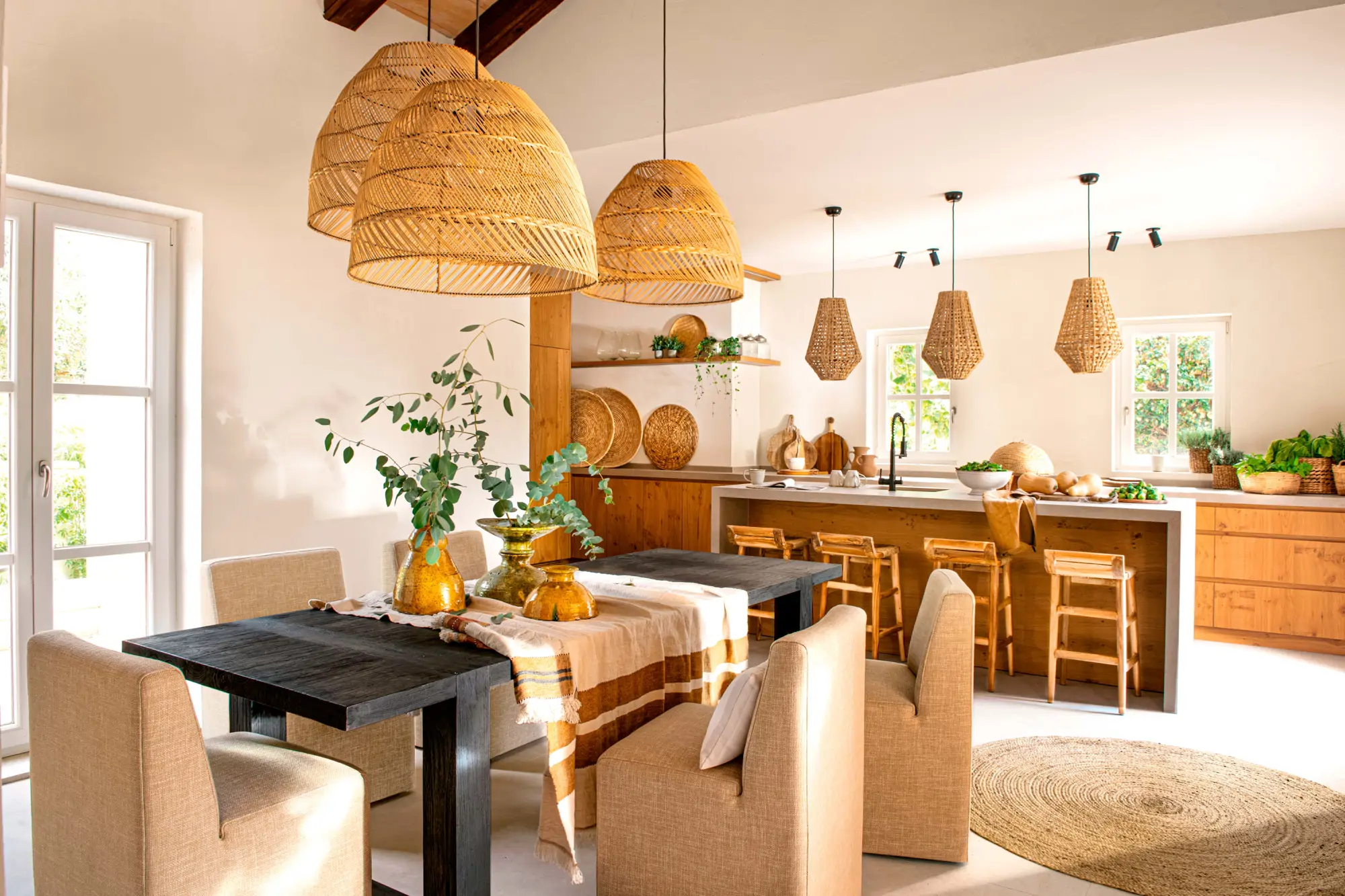 On le constate dans cette cuisine ouverte, où les fibres naturelles sont mises en valeur dans les trois lampes au-dessus de l’îlot, ainsi que dans les luminaires éclairant la table.