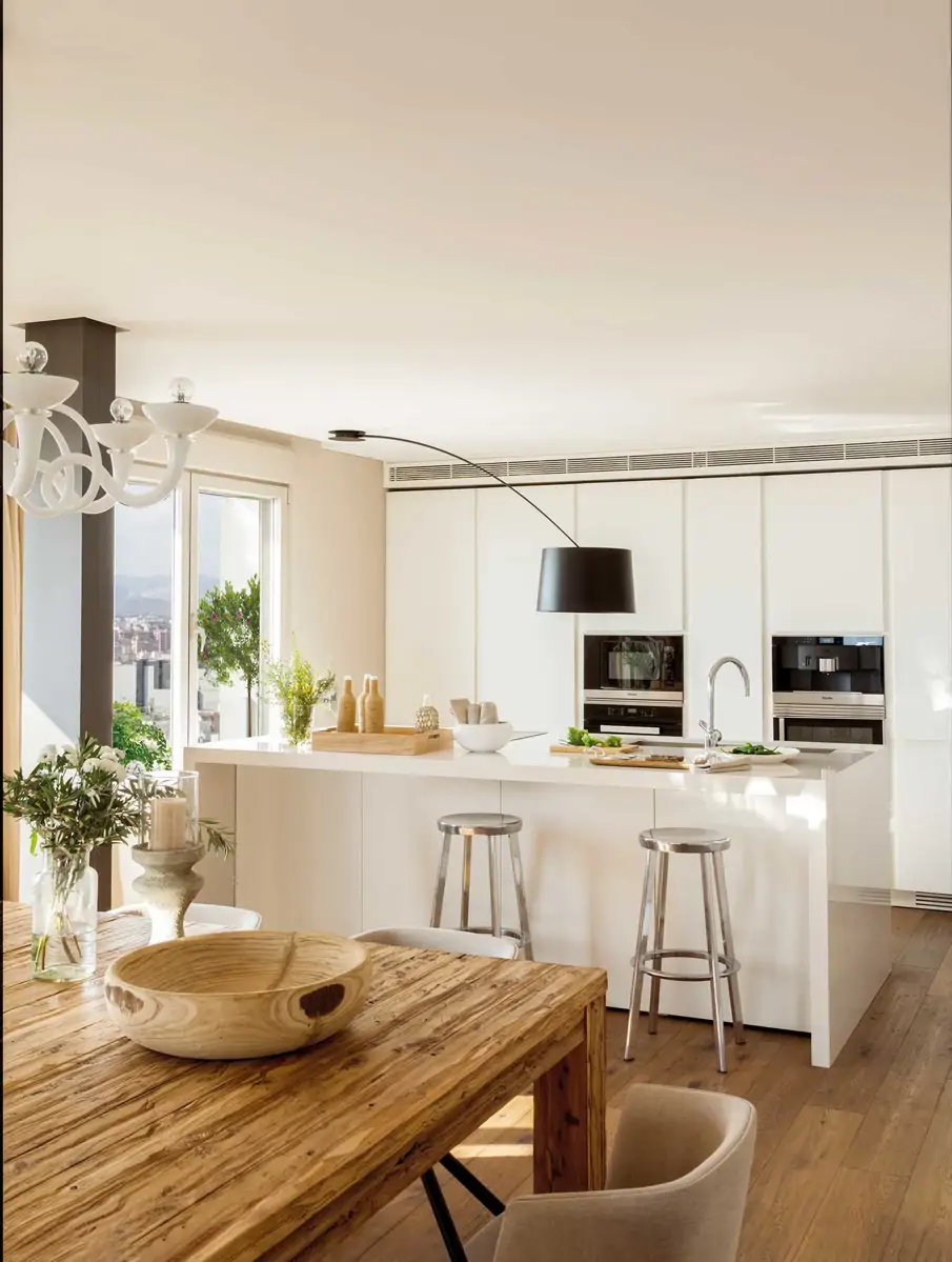 Dans une cuisine blanche ouverte, chaque élément ajouté est essentiel pour souligner sa présence, mais aussi pour différencier cet espace du reste du salon.
