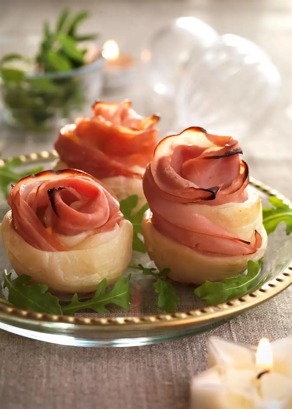 4.Recettes de Noël avec de la pâte feuilletée, des roses en pâte feuilletée au jambon et au fromage