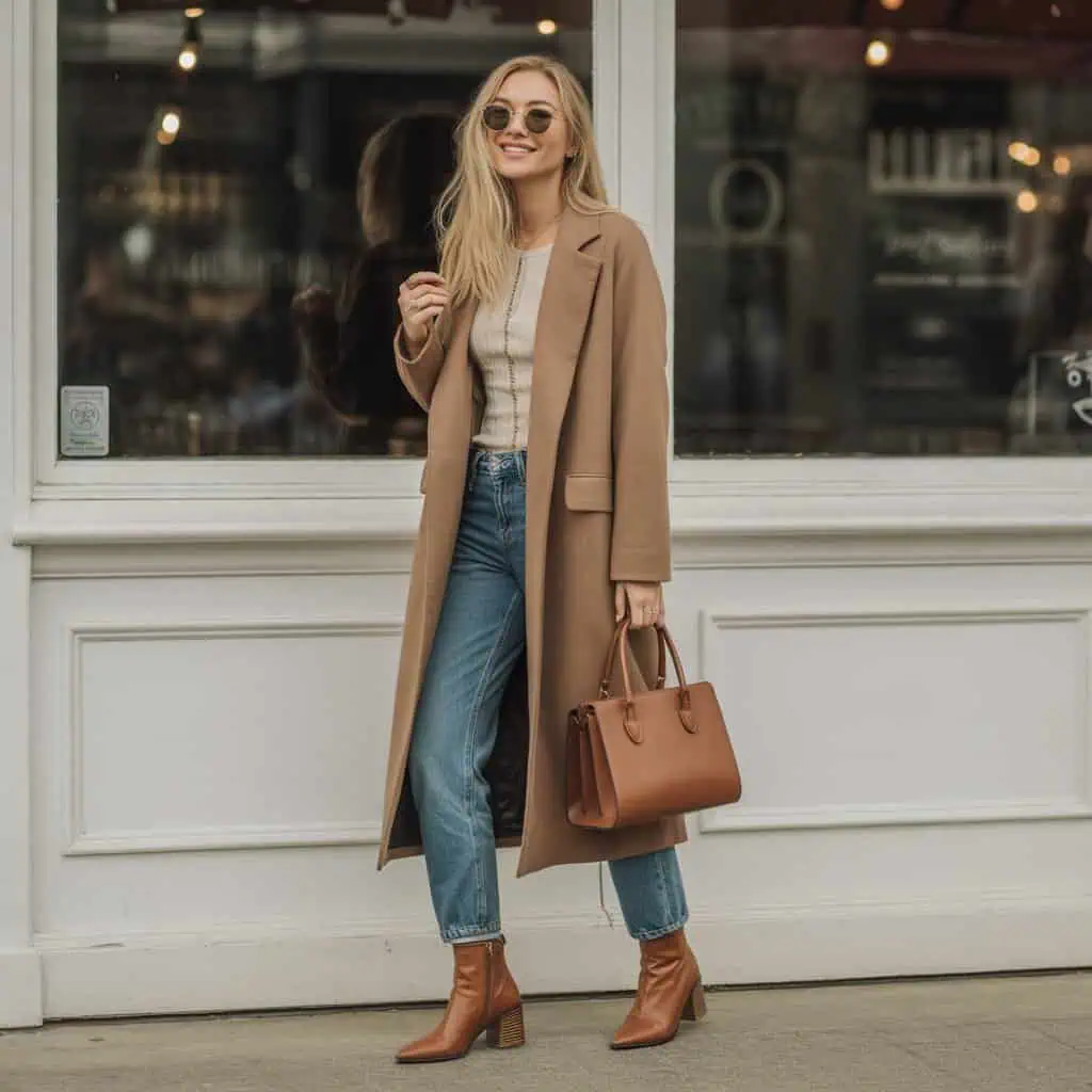 Des bottines en daim cognac ajoutent chaleur et profondeur à l’ensemble, tandis que le sac à main structuré beige apporte une touche sophistiquée.