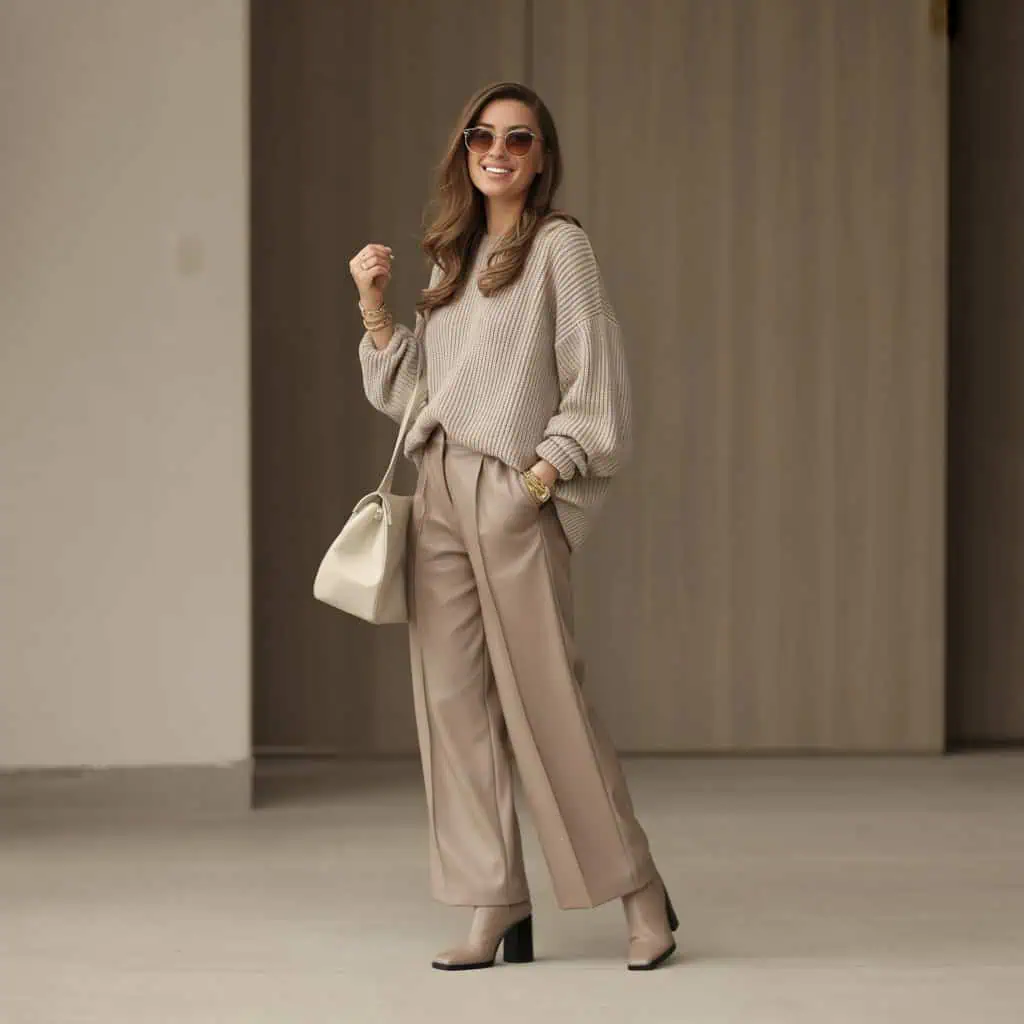 Les bottines en cuir taupe complètent l’ensemble sans l’encombrer, tandis que le sac à main structuré couleur crème apporte une touche de raffinement. Enfin, des accessoires dorés subtilement brillants rehaussent l’allure luxueuse sans ostentation.