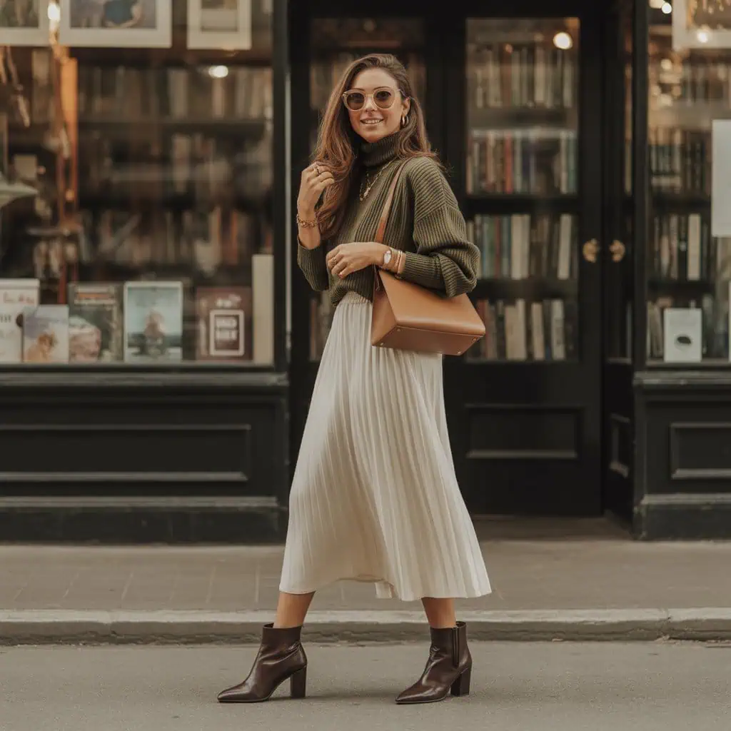 L’association d’un col roulé polyvalent et d’une jupe midi fluide est un classique qui allie avec subtilité structure et féminité. Le col roulé vert olive offre une base riche et naturelle qui se marie parfaitement avec la jupe crème fluide, apportant dimension et originalité à la tenue.