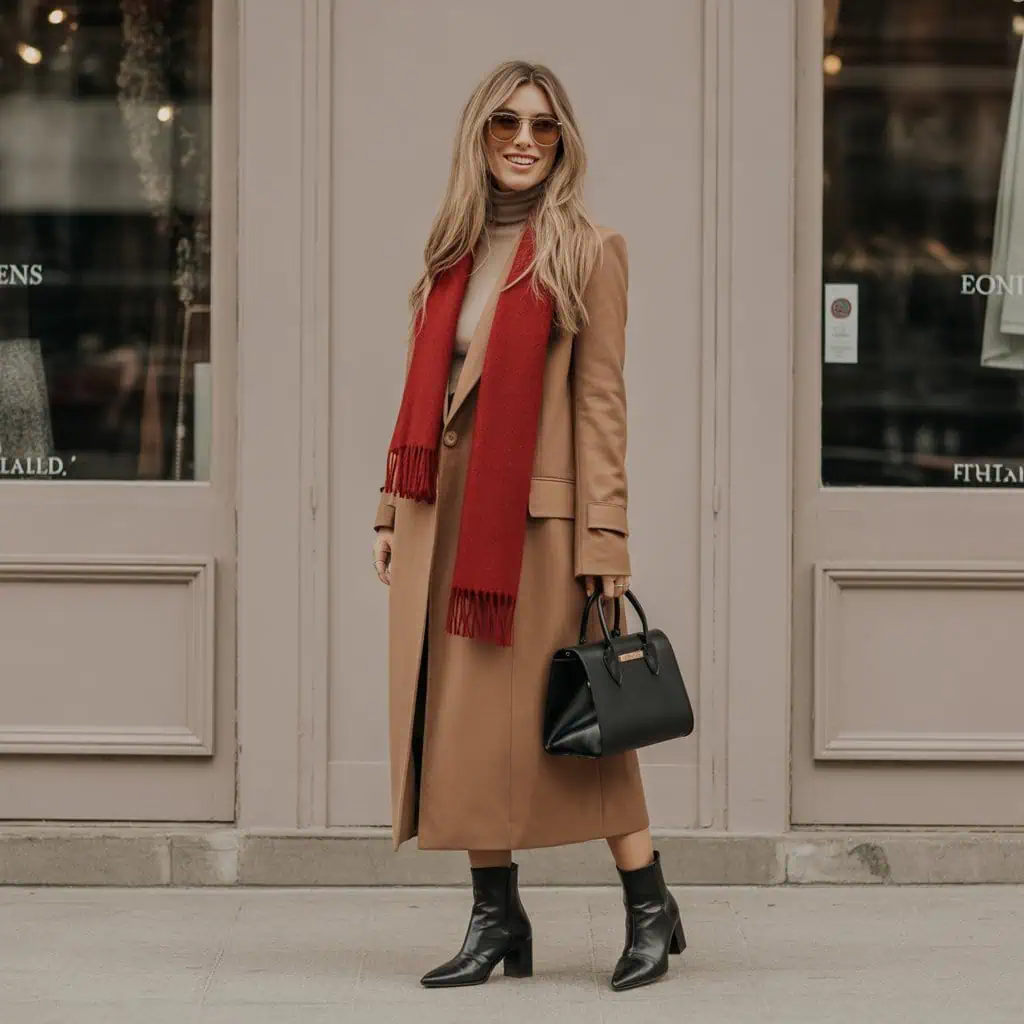 Une écharpe minimaliste en laine rouge injecte une note de couleur vibrante et raffinée, créant un détail qui attire le regard sans surcharger la tenue. Associé à des bottines noires en cuir à talons carrés mi-hauts, ce manteau crée un équilibre chic entre confort et élégance.