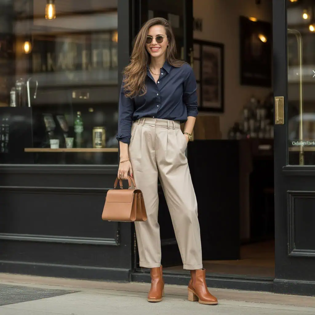 Les bottines en cuir marron foncé ajoutent une touche d’authenticité, tandis que le sac à main structuré beige apporte une note de sophistication supplémentaire.