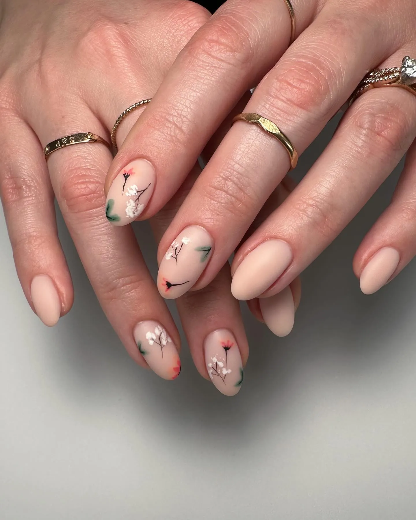 Rien de tel qu’une base nude mate pour un nail art complexe. Cet ensemble floral est l’exemple parfait d’un design polyvalent mais subtil.