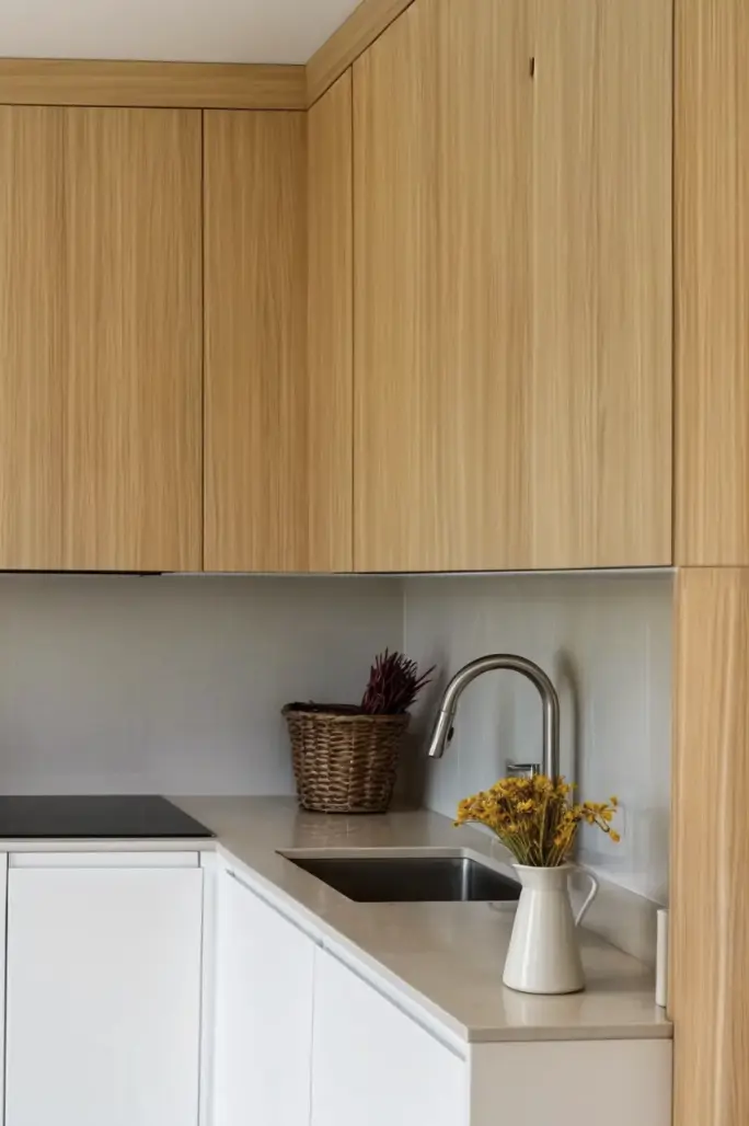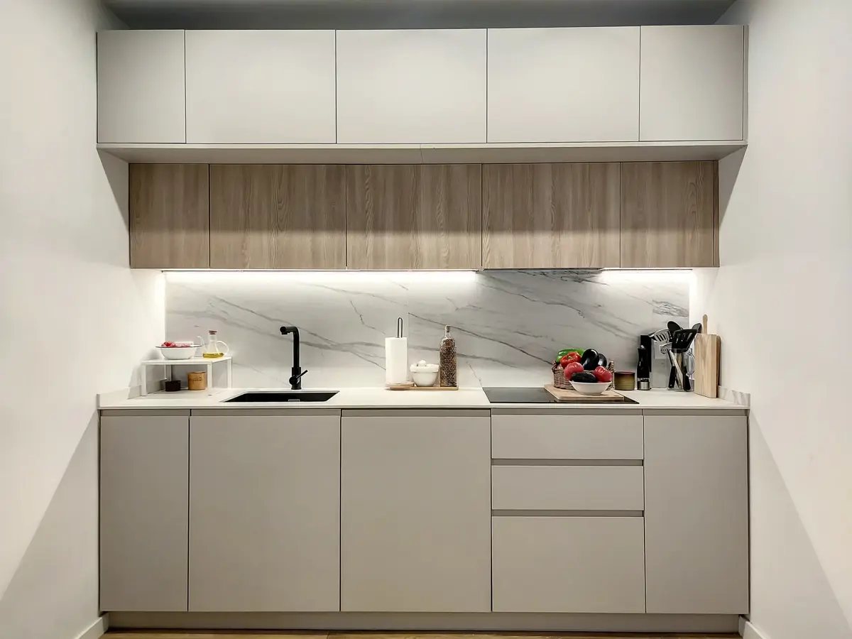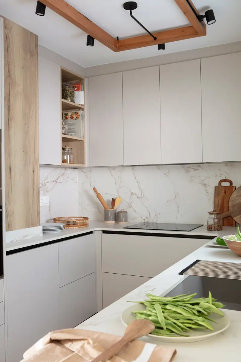 Dans une petite cuisine où l’espace est limité, il est facile de commettre certaines erreurs d’aménagement. Selon Albert, l’une des erreurs les plus fréquentes consiste à ne pas laisser suffisamment d’espace entre les zones de travail principales, par exemple en plaçant l’évier ou la plaque de cuisson contre le réfrigérateur ou contre le mur sans laisser de marge de manœuvre latérale.
