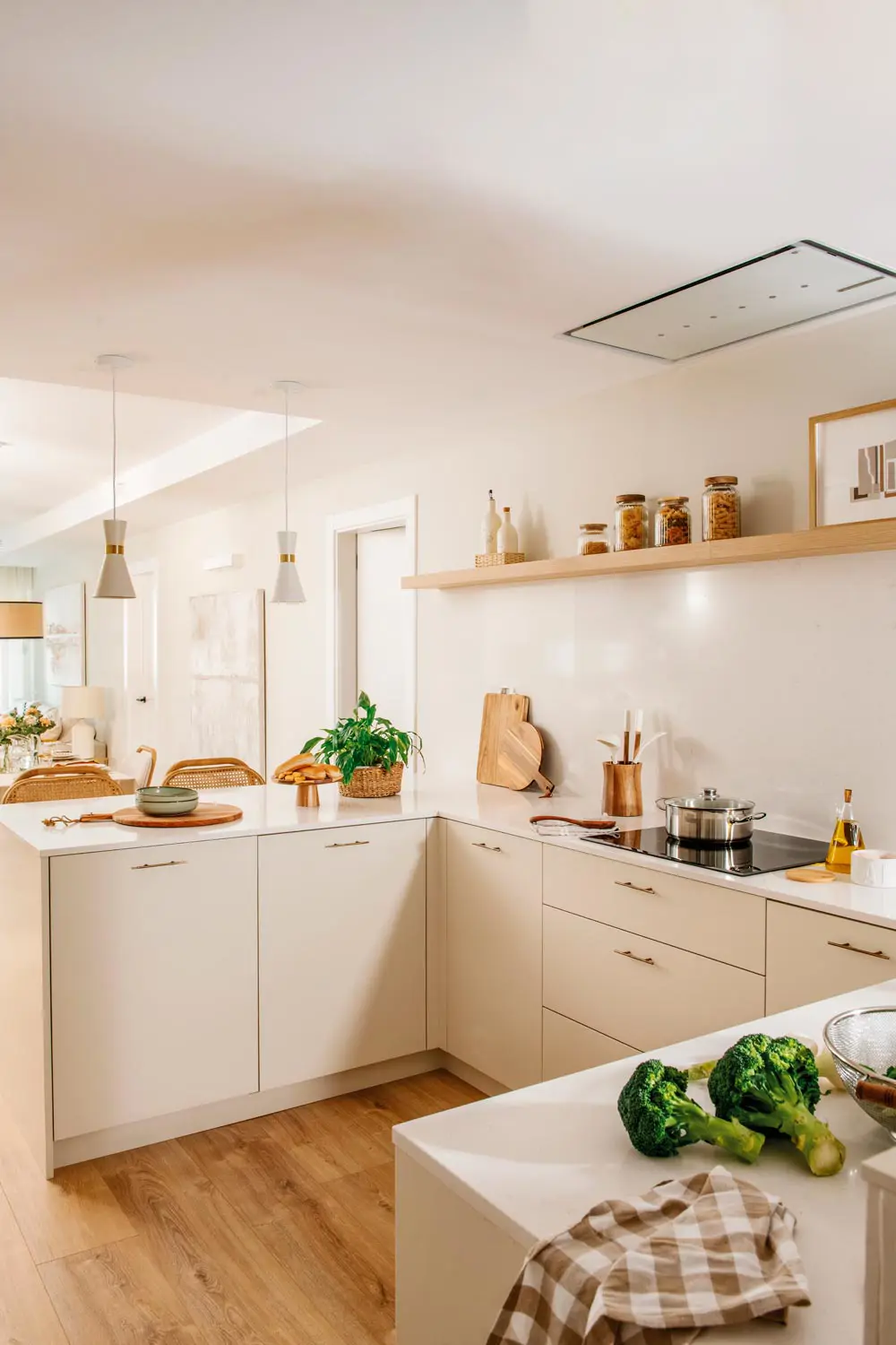 Les couleurs claires et neutres contribuent à créer une impression d’espace. Les placards sans poignées et les appareils électroménagers intégrés permettent d’alléger visuellement l’espace.