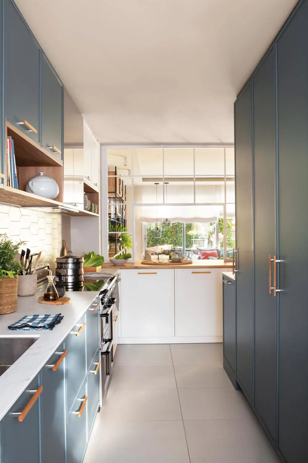 - Cuisine étroite et allongée, de couleur bleue, avec passe-plat.