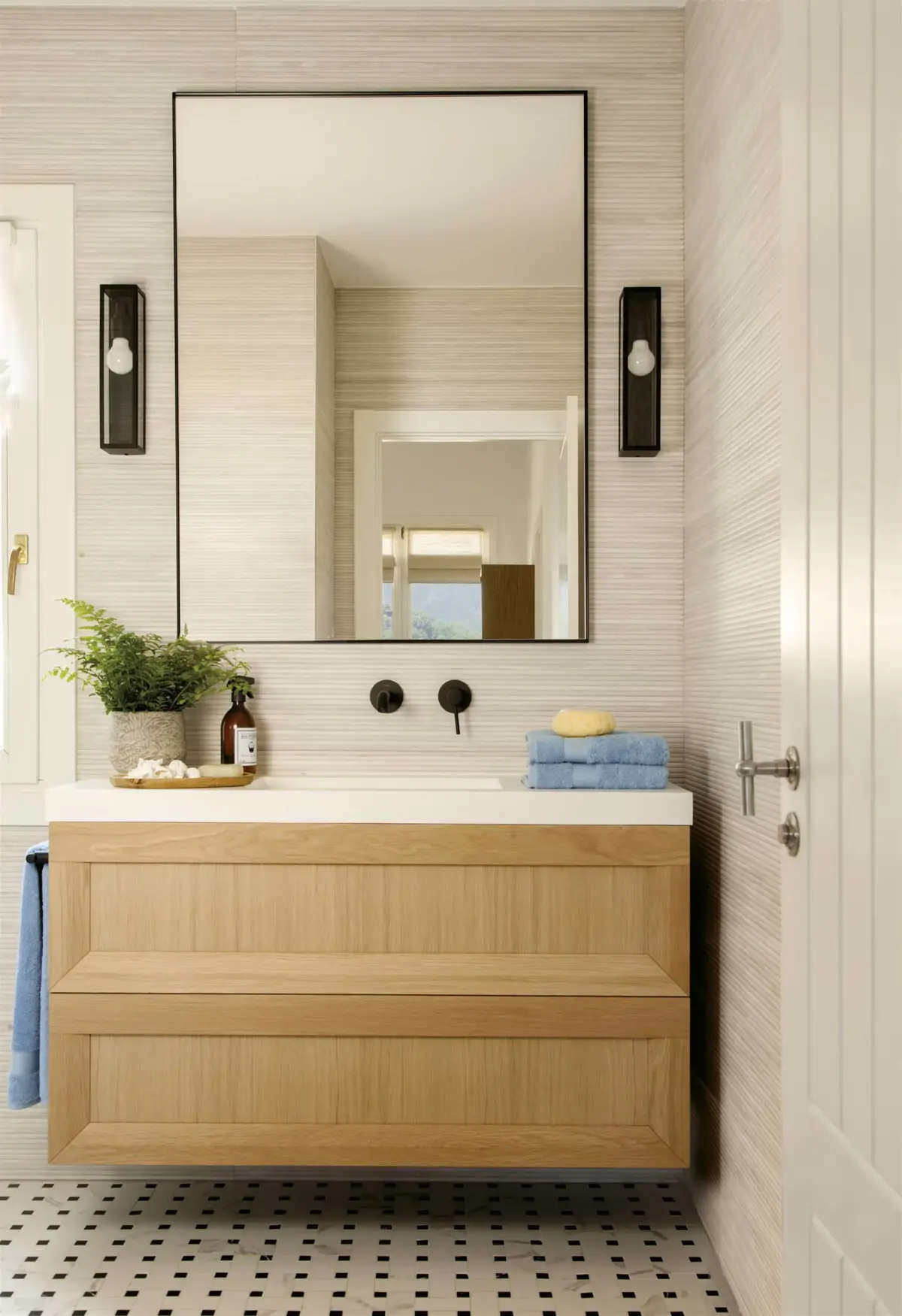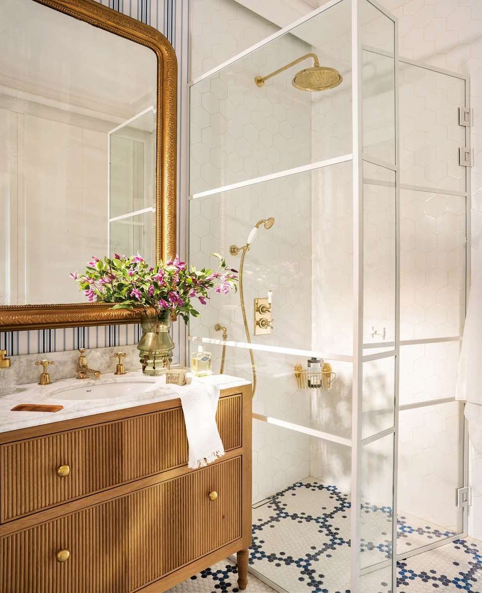 En 2026, les grands imprimés nature sont très tendance, mais les motifs géométriques classiques, comme les rayures et les carreaux, font également un retour en force. Même le tartan, comme on peut le voir dans cette salle de bain décorée par la décoratrice d’intérieur Raquel González, a conquis le cœur des amateurs, car il peut être posé sur tous les murs sans surcharger l’espace.