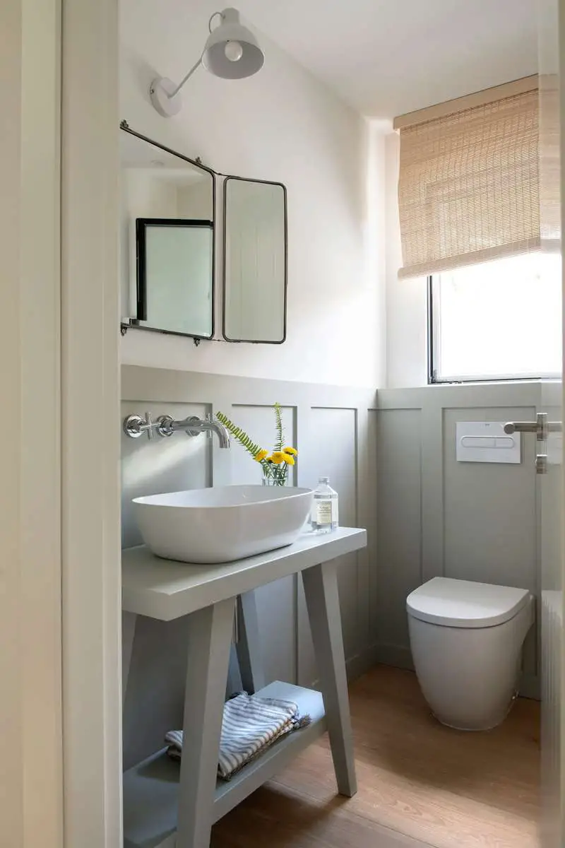 Vous pouvez l’appliquer sur la moitié d’un mur, ainsi que sur le meuble-lavabo, pour un effet subtil. Si vous optez pour cette teinte, veillez à l’associer à d’autres éléments ou matériaux chaleureux, comme un parquet ou un store en bambou.