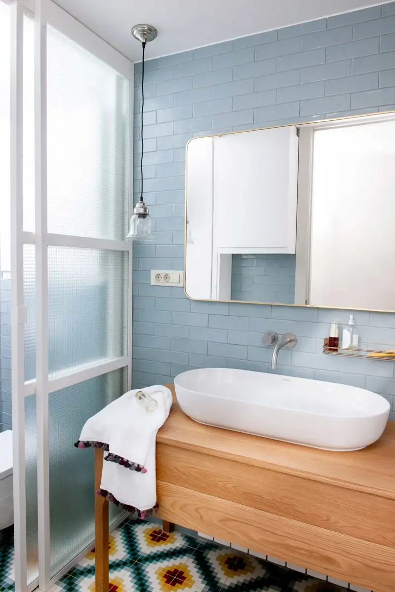 Les tons bleus ont généralement tendance à éloigner visuellement les murs, un atout essentiel dans une petite salle de bain, agrandissant ainsi l’espace et augmentant la luminosité.