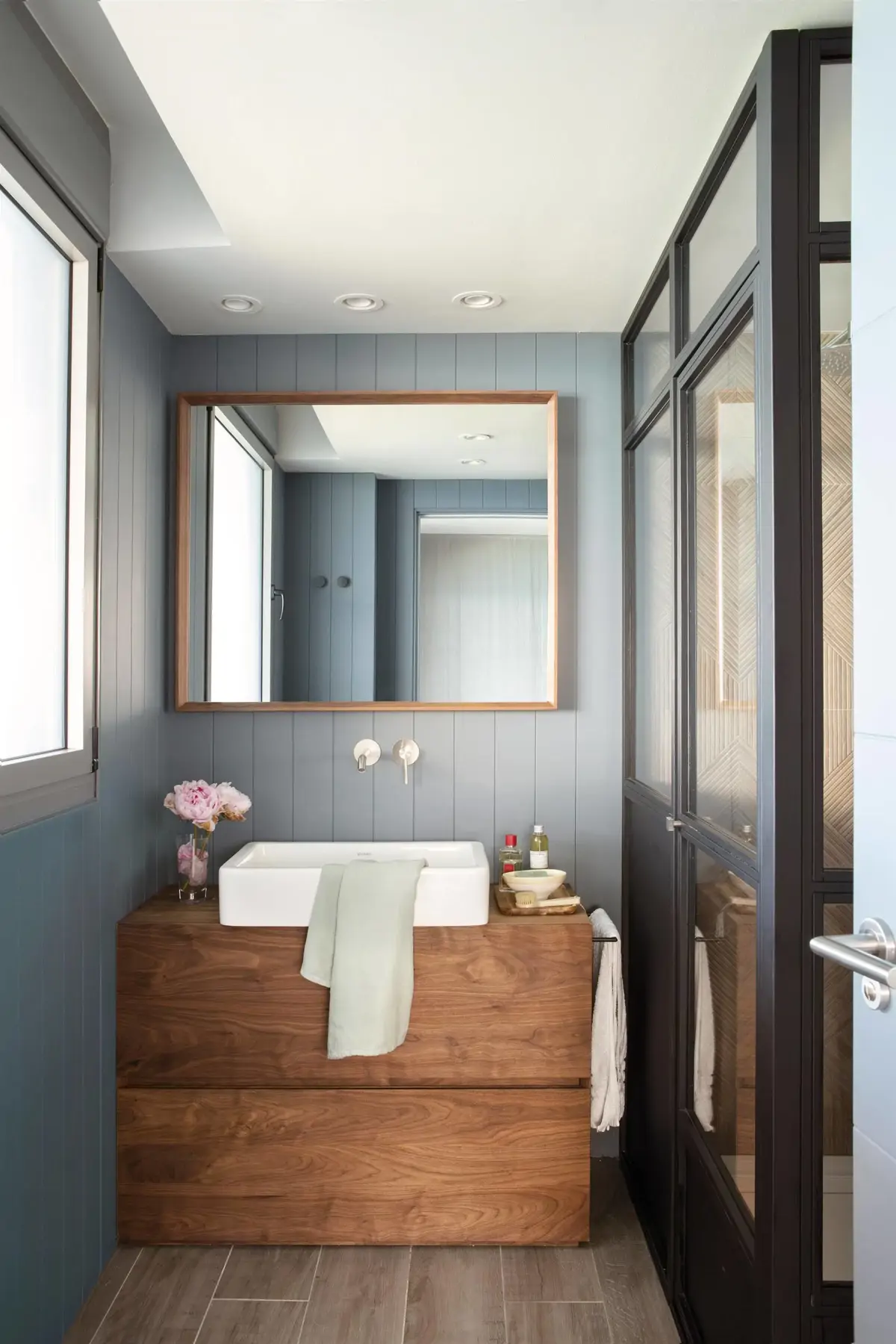 En 2026, le bleu grisâtre s’imposera également dans les petites salles de bains. Élégante et contemporaine, cette couleur apporte une touche design sans être envahissante. Alternative moderne au blanc pur ou au gris, elle confère à la salle de bains une atmosphère unique.