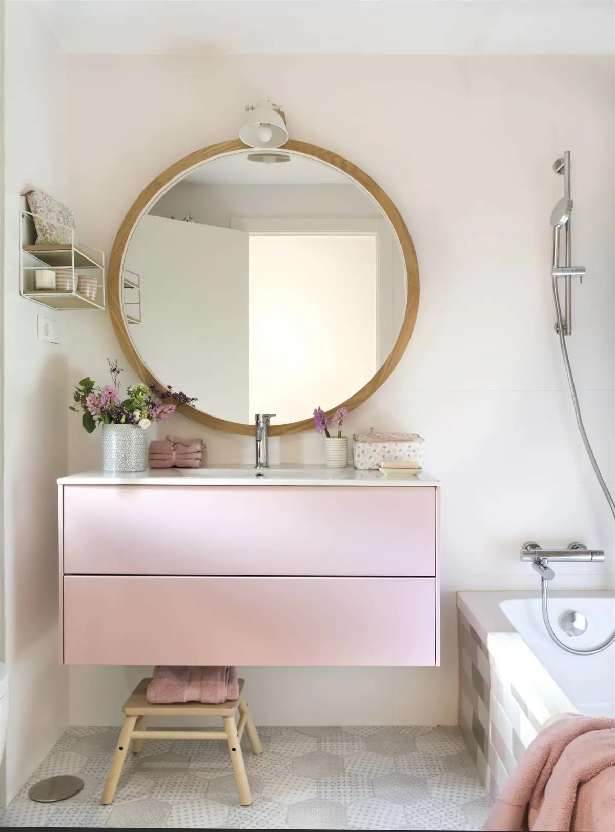 En 2026, les touches de rose, de violet, de pêche, de corail ou de jaune canari seront essentielles pour décorer les petites salles de bains.