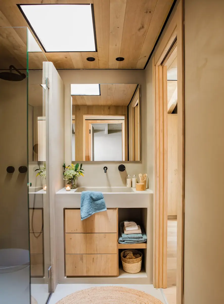 Tout comme le blanc, le bois reste une tendance forte pour les petites salles de bains en 2026. Ce matériau, synonyme de chaleur et d’élégance, se retrouve non seulement dans le mobilier, mais aussi dans les revêtements muraux.