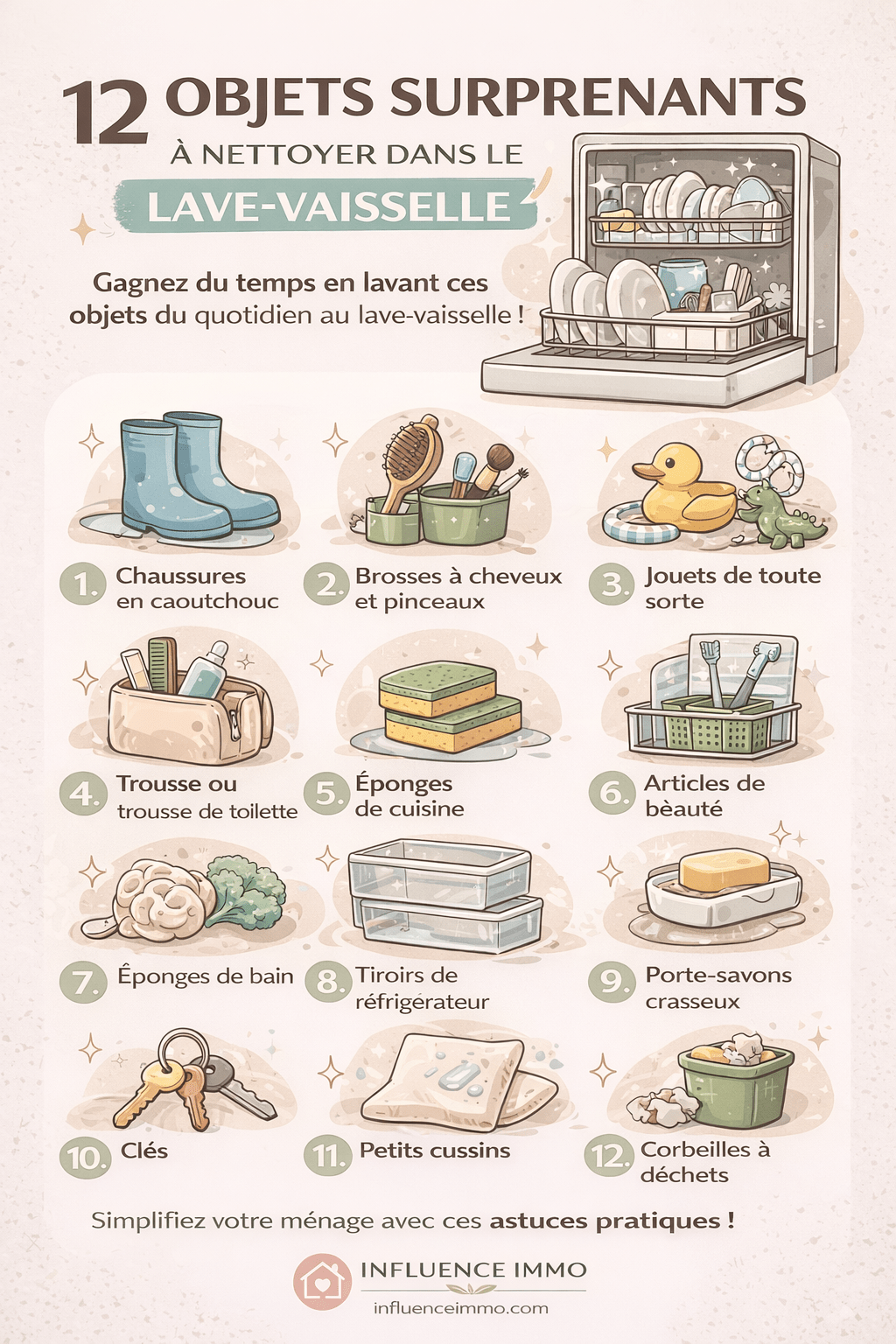 Le lave-vaisselle est un allié du ménage bien plus polyvalent qu’on ne l’imagine. En l’utilisant intelligemment, tu peux gagner du temps, améliorer l’hygiène de ta maison et simplifier ton quotidien — à condition de respecter les matériaux compatibles.