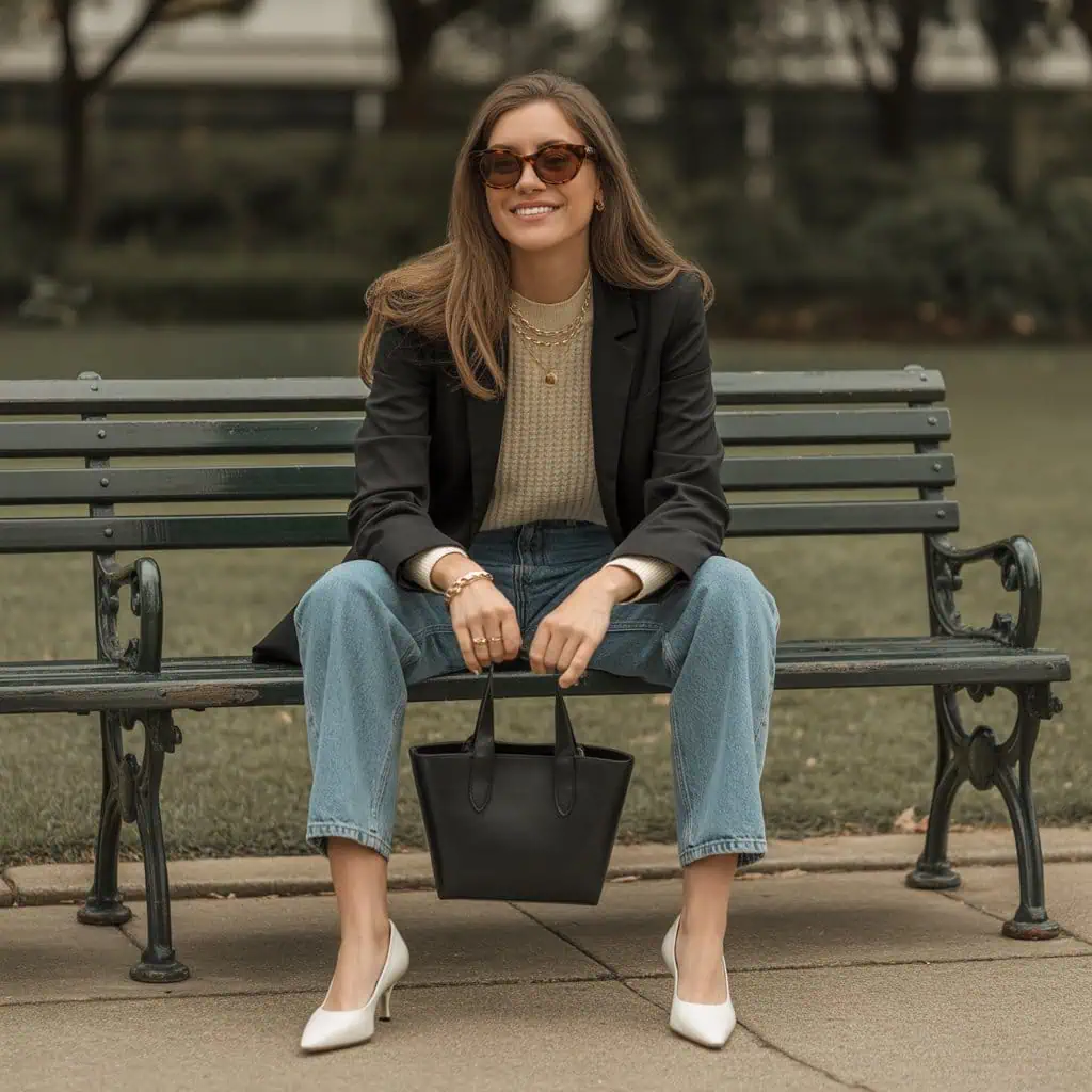Cette combinaison stylée est idéale pour passer d’un look décontracté à un look plus habillé sans sacrifier le confort. Le jean droit ancre la silhouette et y ajoute une touche de modernité, tandis que les colliers dorés superposés et un cabas structuré subliment l’ensemble.
