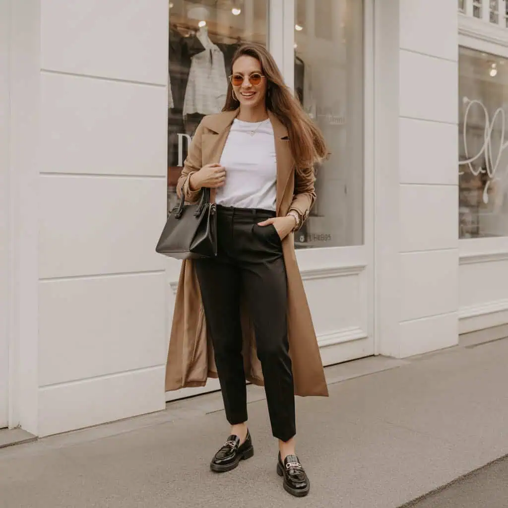 Un trench camel, par exemple, est une pièce intemporelle à superposer, idéale avec un simple t-shirt blanc et un pantalon noir.