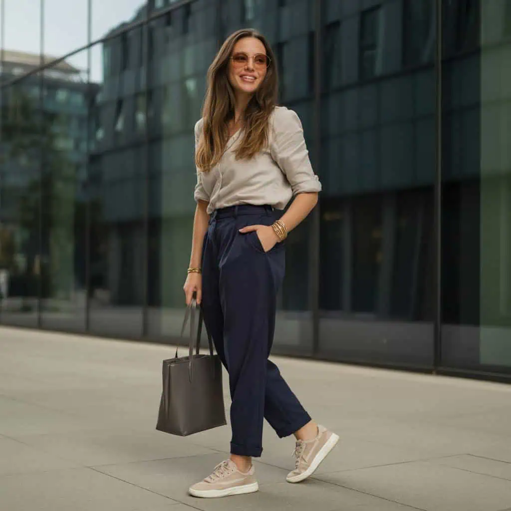 Intégrer un pantalon tailleur peut métamorphoser votre garde-robe, transformant une tenue décontractée en une allure chic en un clin d’œil. Un pantalon bleu marine taille haute, associé à un chemisier blanc ajusté, dessine une silhouette en sablier raffinée, bien plus flatteuse que l’effet ample d’un pantalon large. Ce style souligne la taille et allonge les jambes, donnant une impression de hauteur et d’élégance.