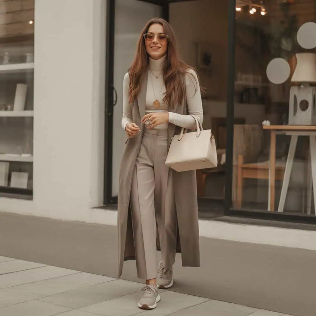 Superposer un gilet long à un pantalon droit apporte instantanément style et harmonie à votre tenue. Ce gilet beige cintré, pièce maîtresse de la tenue, offre une silhouette élégante qui affine la taille tout en allongeant la silhouette.
