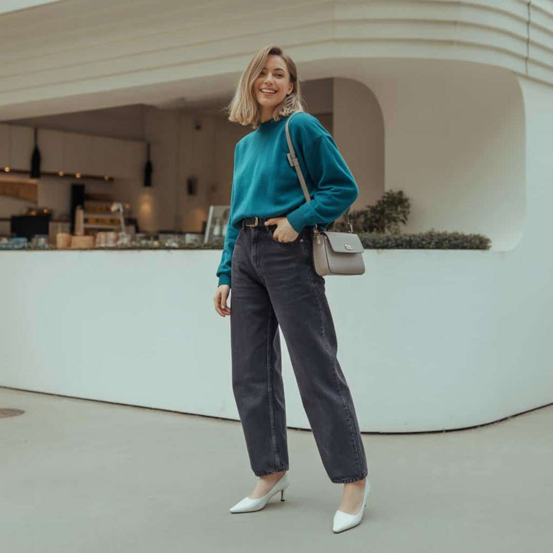 Les silhouettes ceinturées sont idéales pour mettre en valeur les courbes tout en apportant chaleur et confort — un vrai atout pour l’hiver. Ce pull vert-bleu, cintré à la taille, souligne la silhouette tout en structurant la coupe décontractée d’un jean taille haute. Le denim foncé crée un contraste intemporel avec la couleur vive du pull, tandis que les escarpins blancs à petit talon apportent une touche ludique et raffinée à l’ensemble.