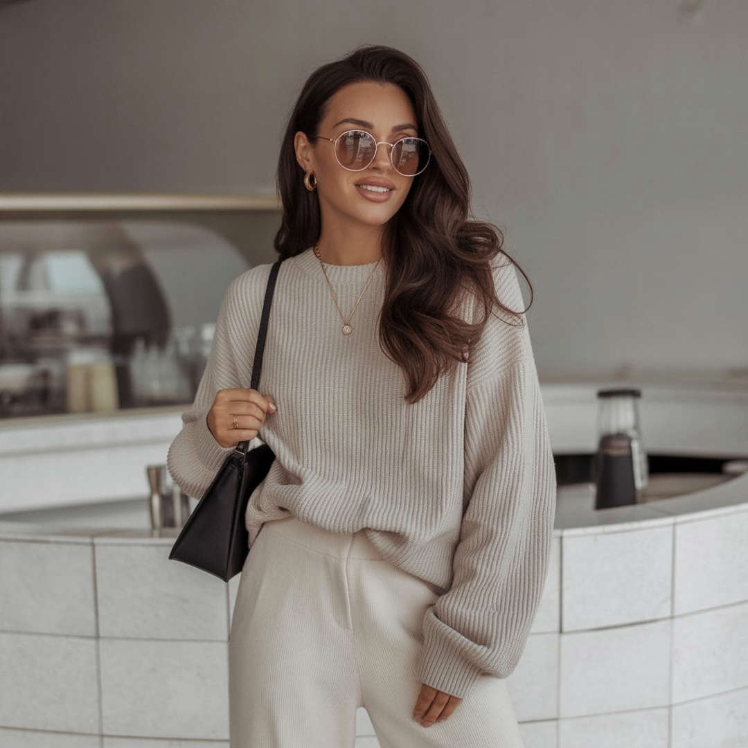 Opter pour un ensemble en maille monochrome est une excellente façon d’arborer un look immédiatement élégant tout en restant bien au chaud. Le pull oversize rentré dans un pantalon assorti crée un effet structuré et moderne, parfaitement dans l’air du temps. La teinte beige apporte douceur et sophistication, idéale pour les journées d’hiver, tandis que de légères ondulations dans les cheveux renforcent le côté effortless du look.