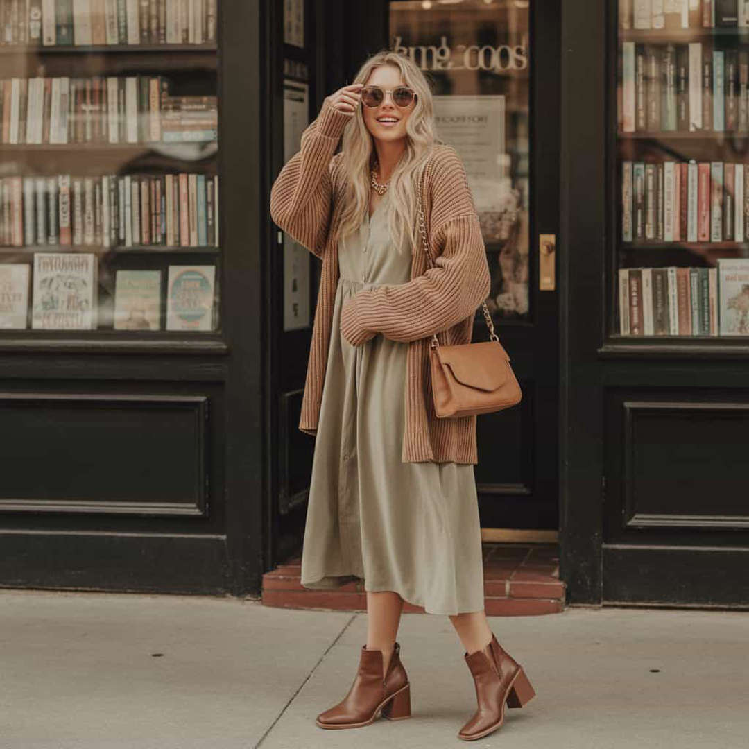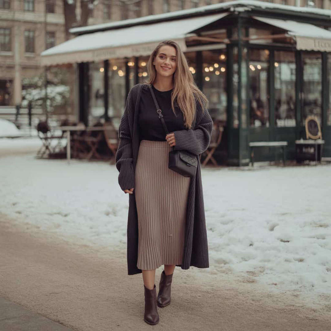En ajoutant des bottines robustes et chic, vous gagnez quelques centimètres tout en gardant les pieds bien au chaud. Un cardigan couleur avoine apporte une texture douce et cosy, tandis que des bijoux en chaîne dorée viennent sublimer l’ensemble avec subtilité. Une tenue qui respire l’assurance et le style naturel, parfaite pour flâner en ville avec élégance.