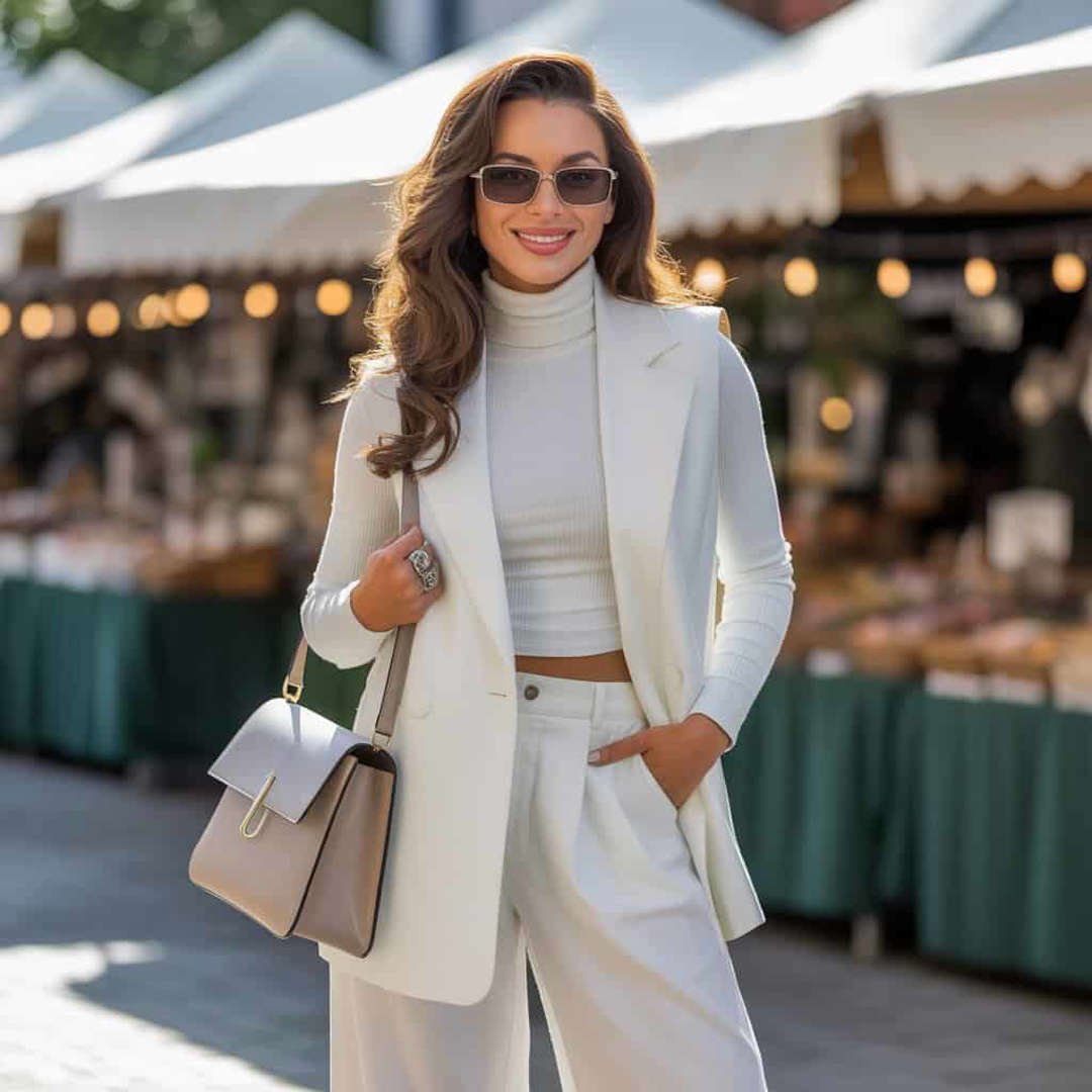 Les escarpins blancs à petit talon apportent un contraste chic, et un sac structuré noir devient le point central stylé de la tenue. Quelques bijoux dorés minimalistes et des lunettes de soleil oversize ajoutent une touche glamour — parfaite pour attirer tous les regards sans effort, même par temps froid.