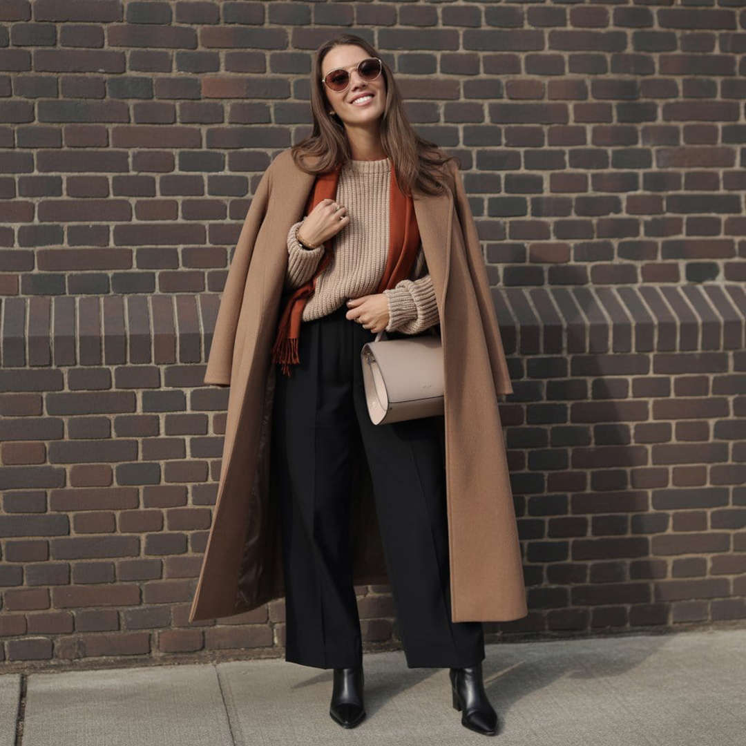 Pour renforcer cette élégance sans effort, on ajoute un manteau camel — une pièce intemporelle qui apporte chaleur, sophistication et permet de passer de l’extérieur à l’intérieur en toute fluidité. L’écharpe couleur rouille vient dynamiser l’ensemble avec une nuance riche et chaleureuse, idéale pour réveiller une palette neutre.