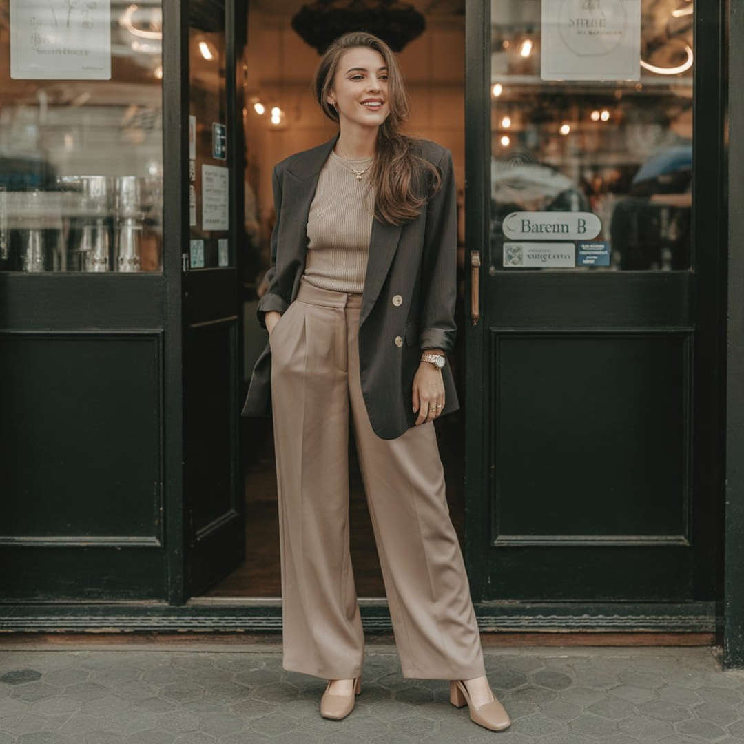 Cet ensemble est l’équilibre parfait entre élégance et décontraction, idéal pour affronter l’hiver avec style. Un blazer cintré transforme un pull en maille décontracté en une pièce sophistiquée, rehaussant une tenue simple et lui donnant immédiatement du caractère. La fermeture à un seul bouton crée une silhouette épurée, parfaitement harmonieuse avec un pantalon à jambes larges, alliant confort et modernité.