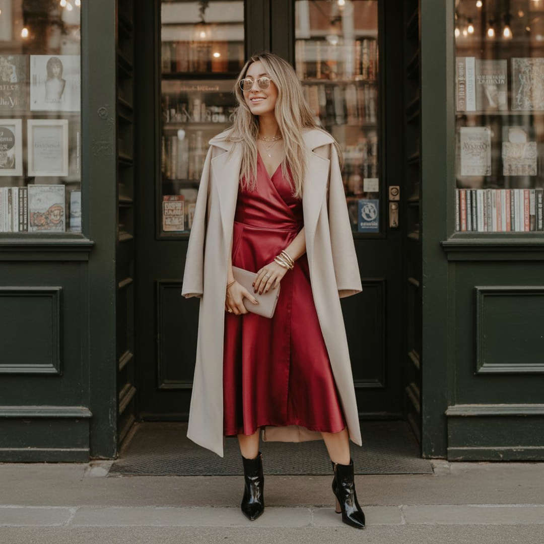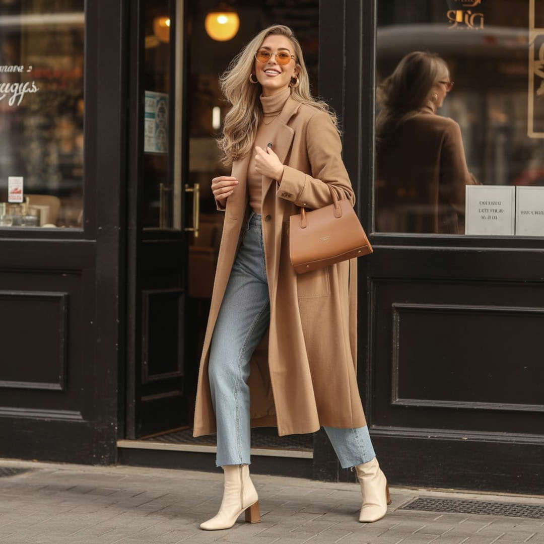 Pour compléter la tenue, superposez un manteau cintré — une teinte crème raffinée apporte immédiatement chaleur et sophistication sans alourdir le look. Les bottines à talons allongent la jambe et ajoutent une touche élégante, tandis que quelques accessoires bien choisis, comme des bijoux originaux ou une pochette minimaliste, modernisent l’ensemble.