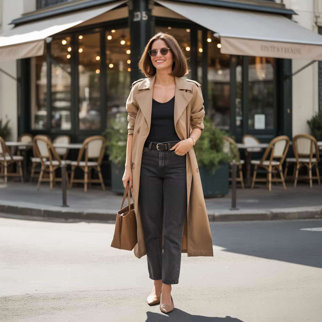 Un trench léger couleur sable porté sur un top noir simple apporte immédiatement une touche de sophistication à votre garde-robe hivernale. Cette pièce classique réchauffe tout en rendant n’importe quelle tenue instantanément chic.