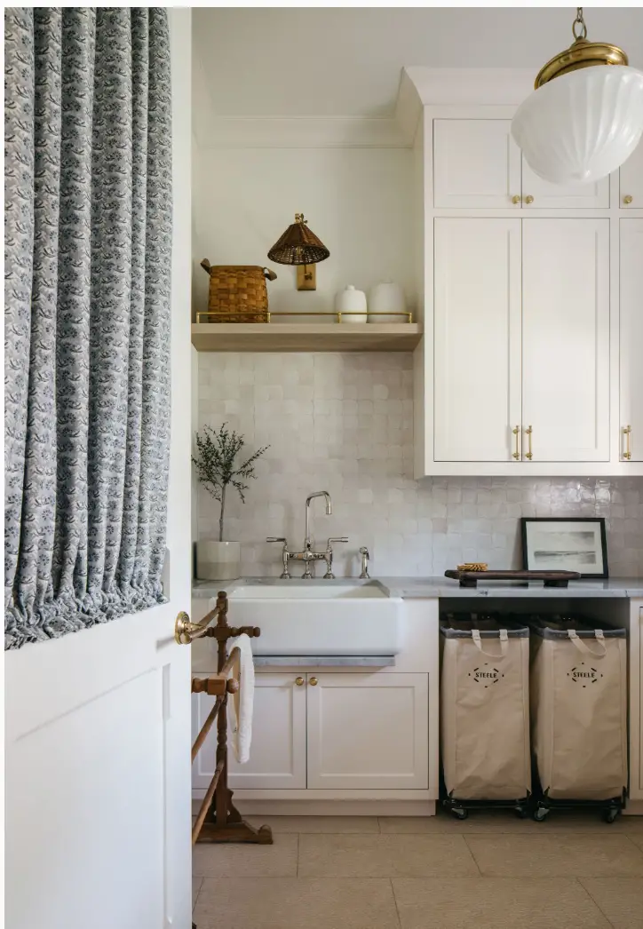 Soyons honnêtes : personne n’a envie de laisser ses sous-vêtements ou son linge sale à la vue de tous. Pour préserver l’intimité de cette maison de campagne d’inspiration française, la décoratrice Kate Marker a opté pour des rideaux froncés placés devant la porte. Une solution simple et astucieuse qui apporte immédiatement une touche de douceur et de charme à la buanderie, tout en dissimulant élégamment ce qui doit l’être.